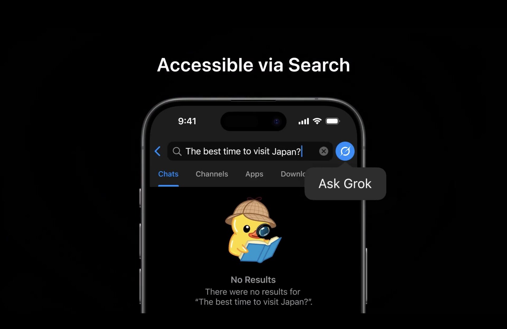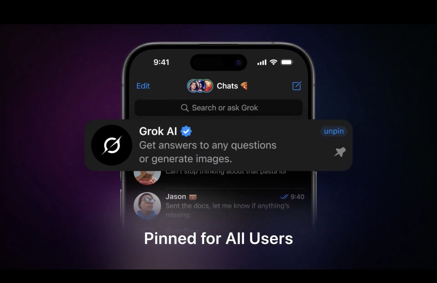 Начать стоит с того, что после апдейта по умолчанию чат с чат-ботом Grok будет закреплён первым в списке для всех пользователей мессенджера Telegram (судя по кнопке с надписью unpin, его можно будет открепить, если пользователю это не очень нужно). Кроме того, получить доступ к Grok можно будет через строку поиска — теперь она предоставляет возможность не только искать информацию (или пользователей/каналы), но и получать ответы от искусственного интеллекта. И чтобы пользователи не путали поиск с ИИ, справа от строки появится синяя кнопка с логотипом чат-бота.