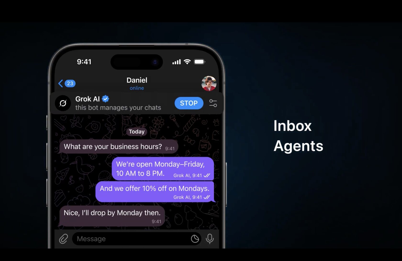 Или Grok может выступать в роли автоответчика (Inbox Agent), отвечая на вопросы пользователей. К примеру, в ролике-демонстрации ИИ ответил на вопрос о рабочих часах пользователя. Правда, если с этим примером всё ясно (рабочие часы пользователи Telegram давно могут указывать у себя в профиле), то откуда Grok будет брать информацию для ответов на другие вопросы — не совсем понятно.