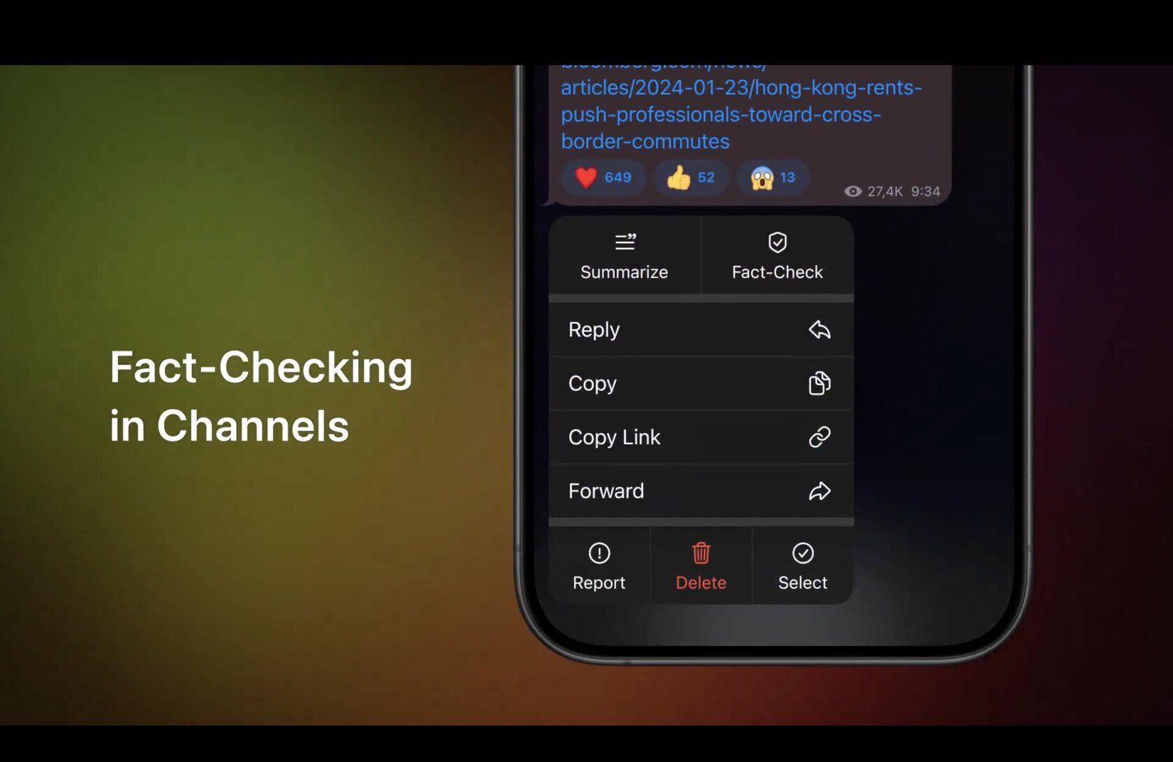 Пожалуй, наиболее полезной функцией интегрированного ИИ в Telegram можно назвать инструмент факт-чекинга. Пользователю достаточно выделить пост, нажать на кнопку Fact-Check, после чего ИИ проверит достоверность информации и сообщит результат (нечто похожее работает в социальной сети X).