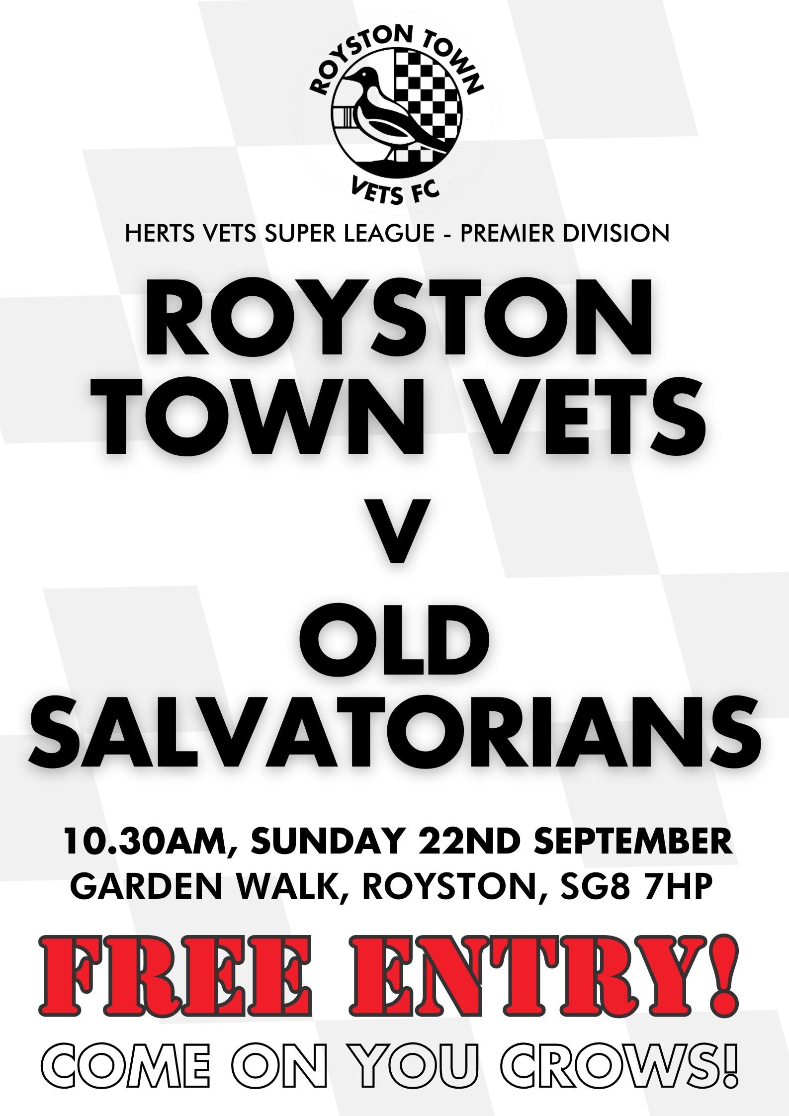 Last up, Royston Town Vets host Old Salvatorians Vets in the Herts Vets League, Sunday, 10:30am kick off. Royston Town won 2-0 at Lea Sports Vets with Stuart Cooke and Chris Geldart, while Old Salvations Vets have had a bad start losing their opening 2 matches without scoring.