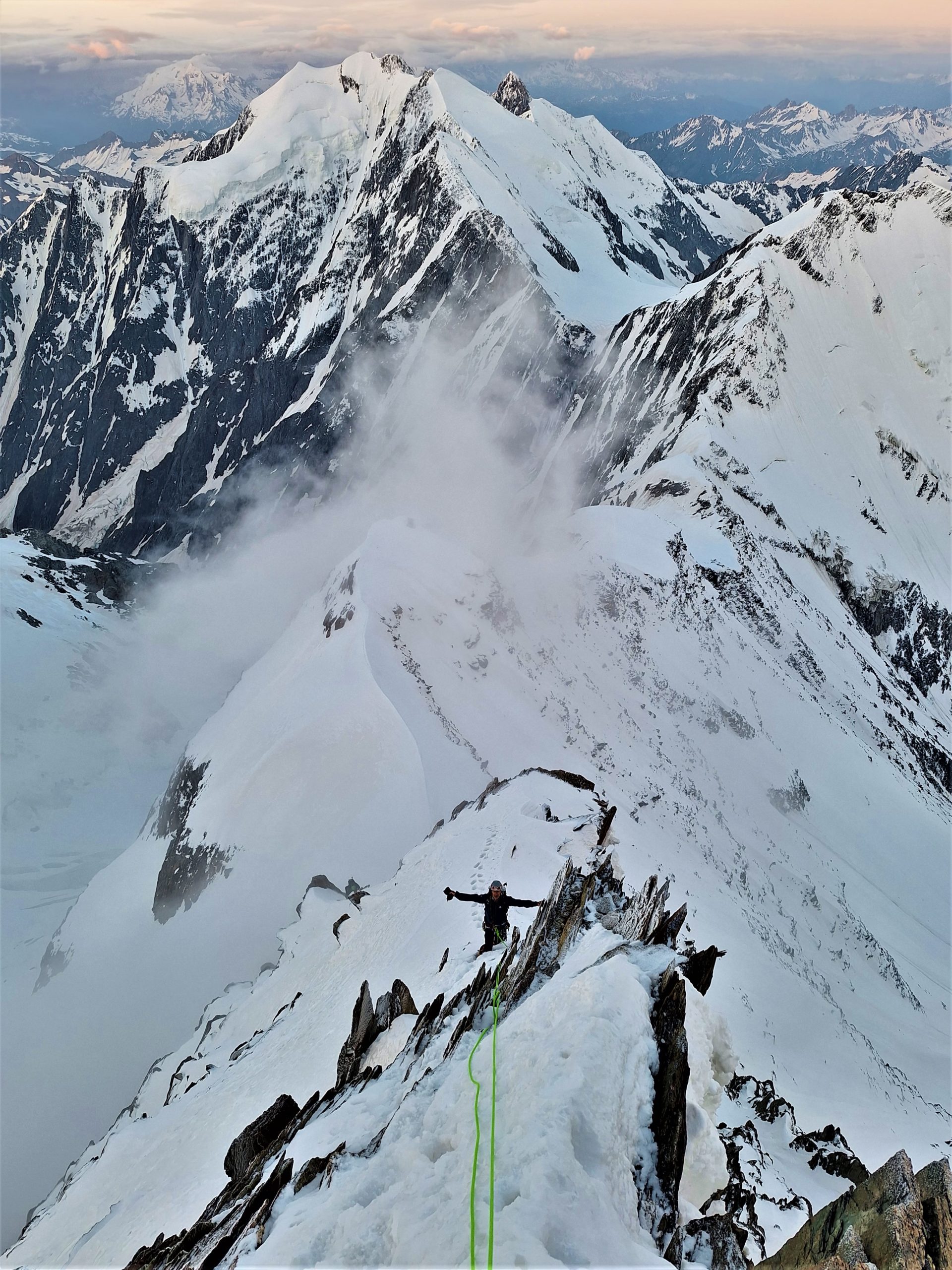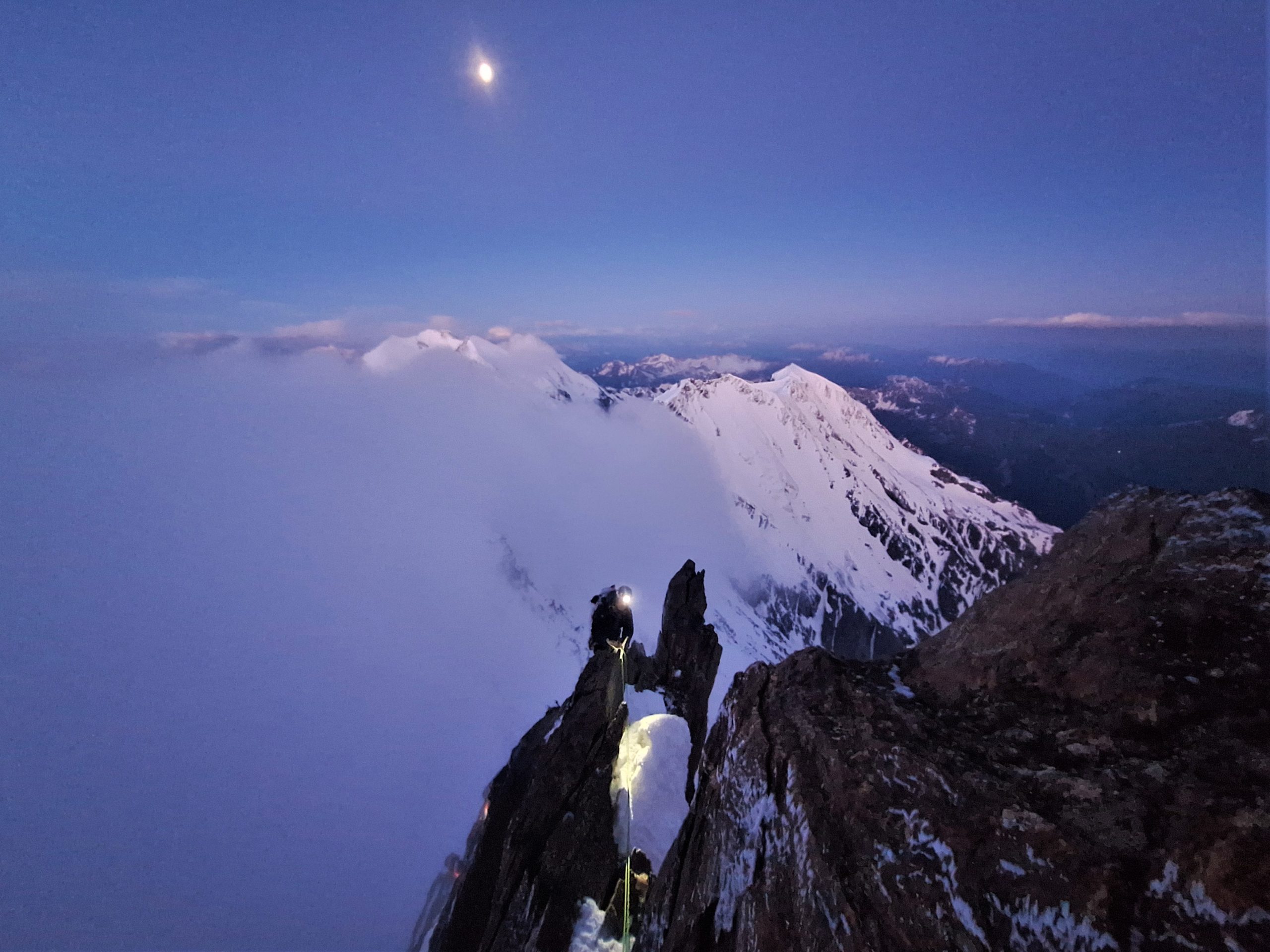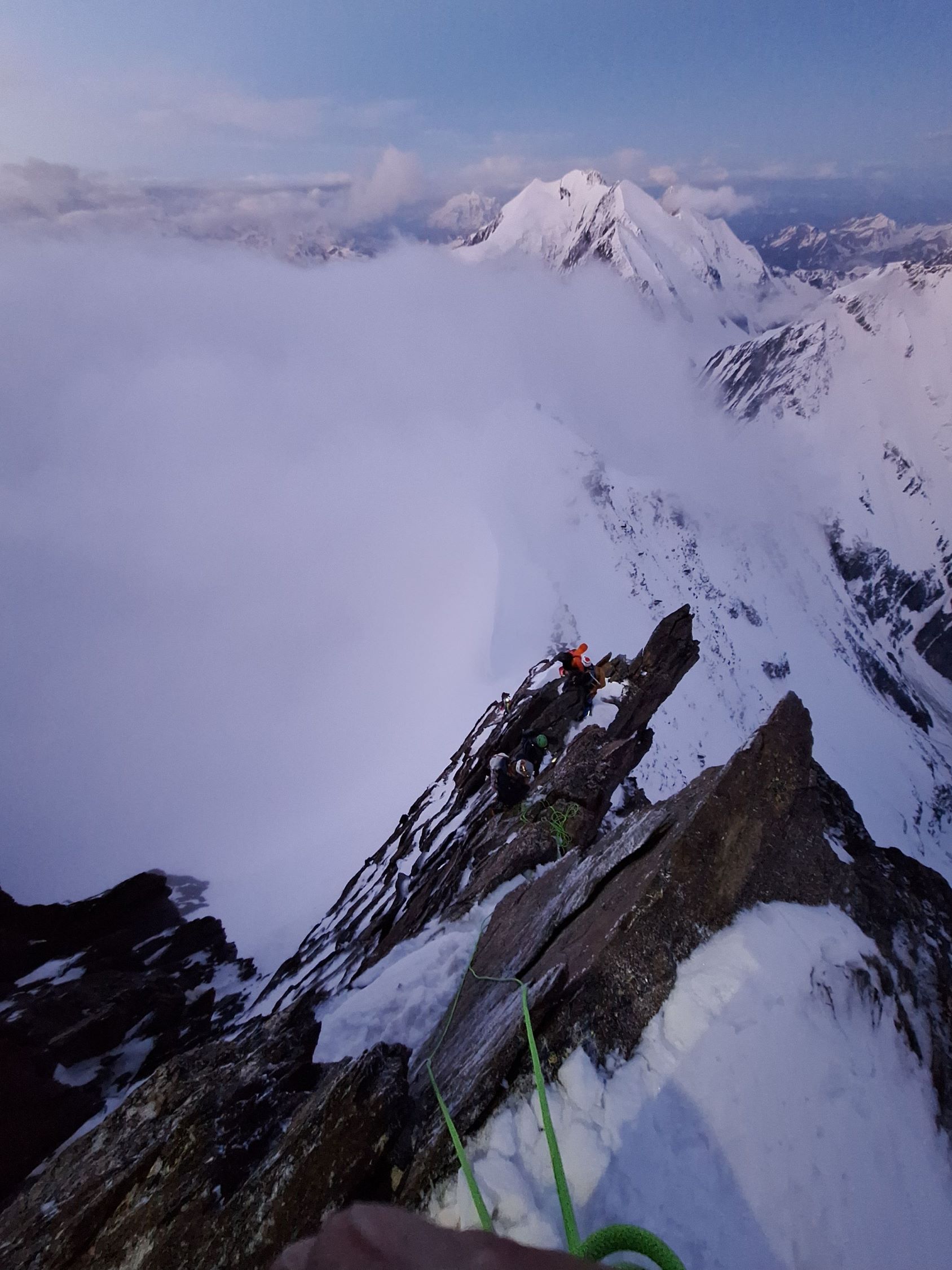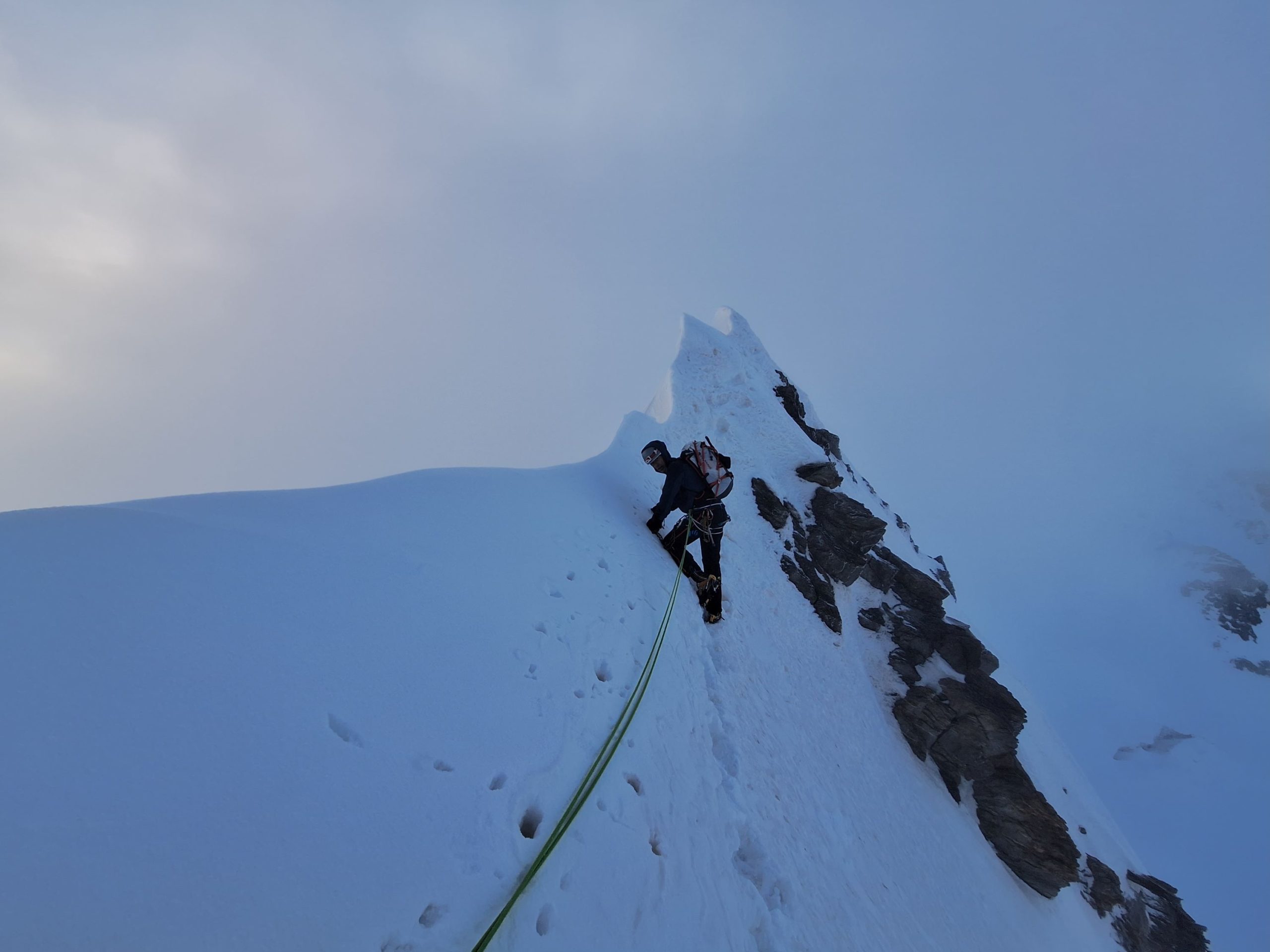 Bien heureusement, l’ambiance depuis la veille au refuge et l’avant veille avec certaines cordées, est très bienveillante et collaborative. Les cordées se replacent logiquement et nous retrouvons les jeunes autrichiens dans la partie vraiment grimpante de l’aiguille. La grimpe est divine dans la pénombre du jour qui se lève et les nuages qui s’accrochent encore à l’arête.