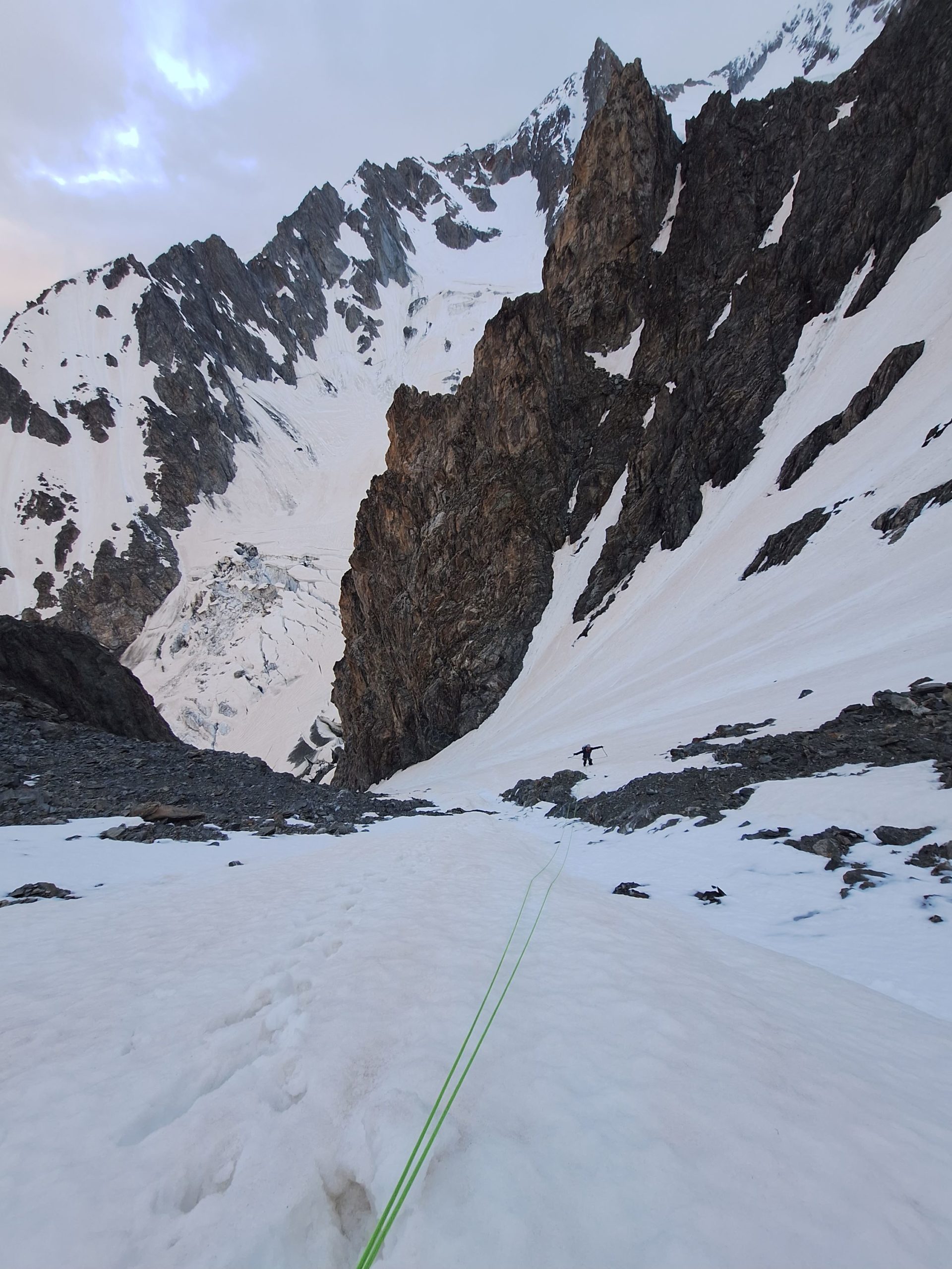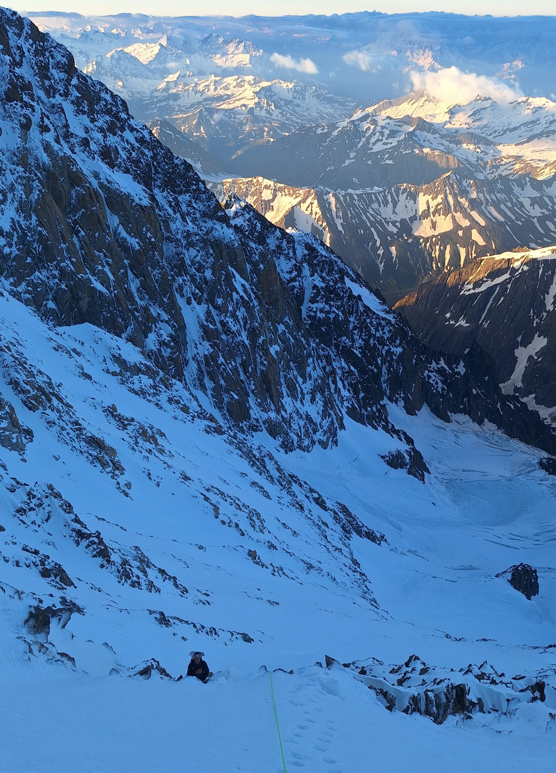 Nous parcourons le couloir vers 6h, l’heure du regel maximum en cette saison. Nous profitons d’une goulotte profonde en neige dure creusée par les coulées de neige lourde.