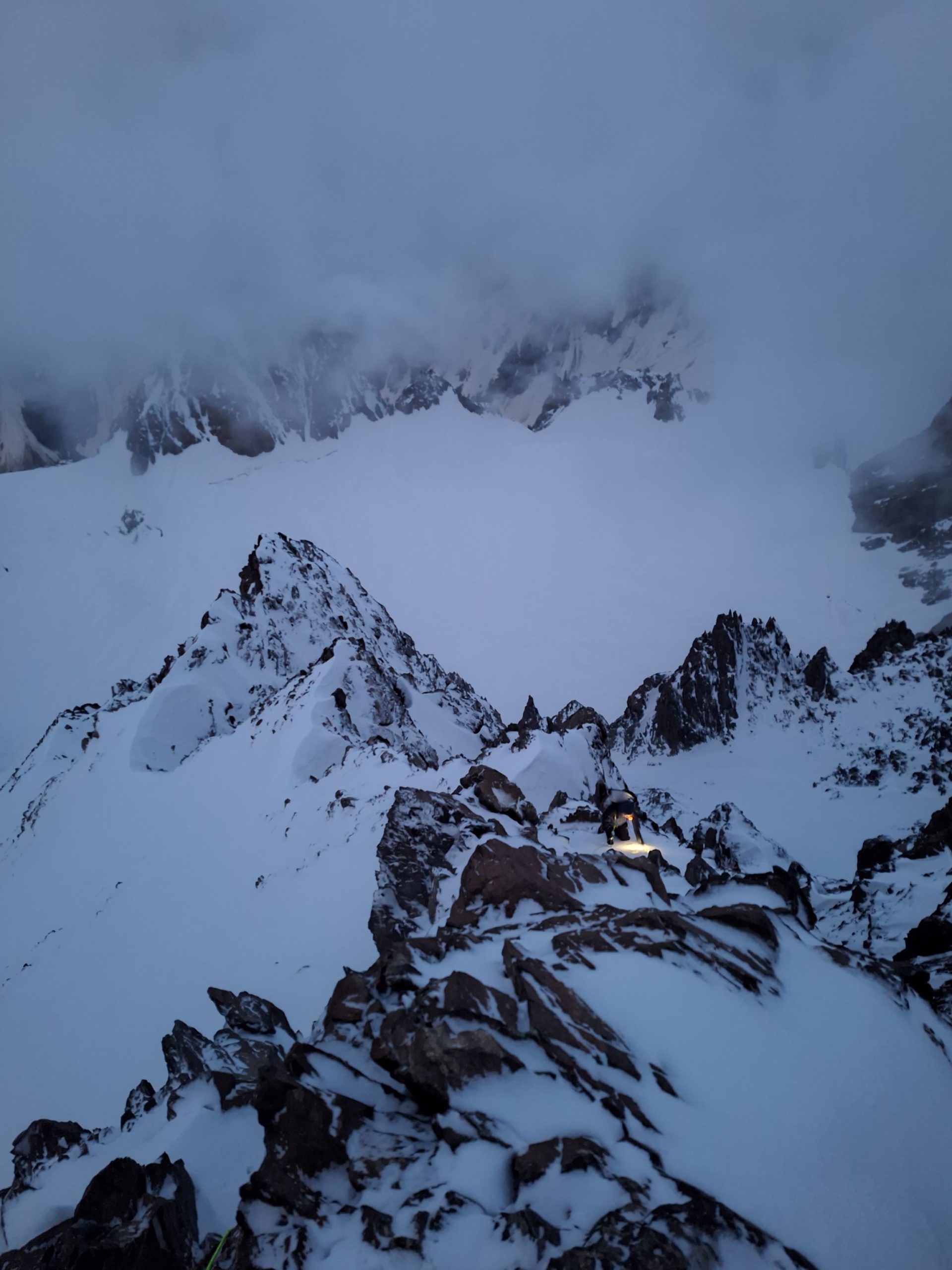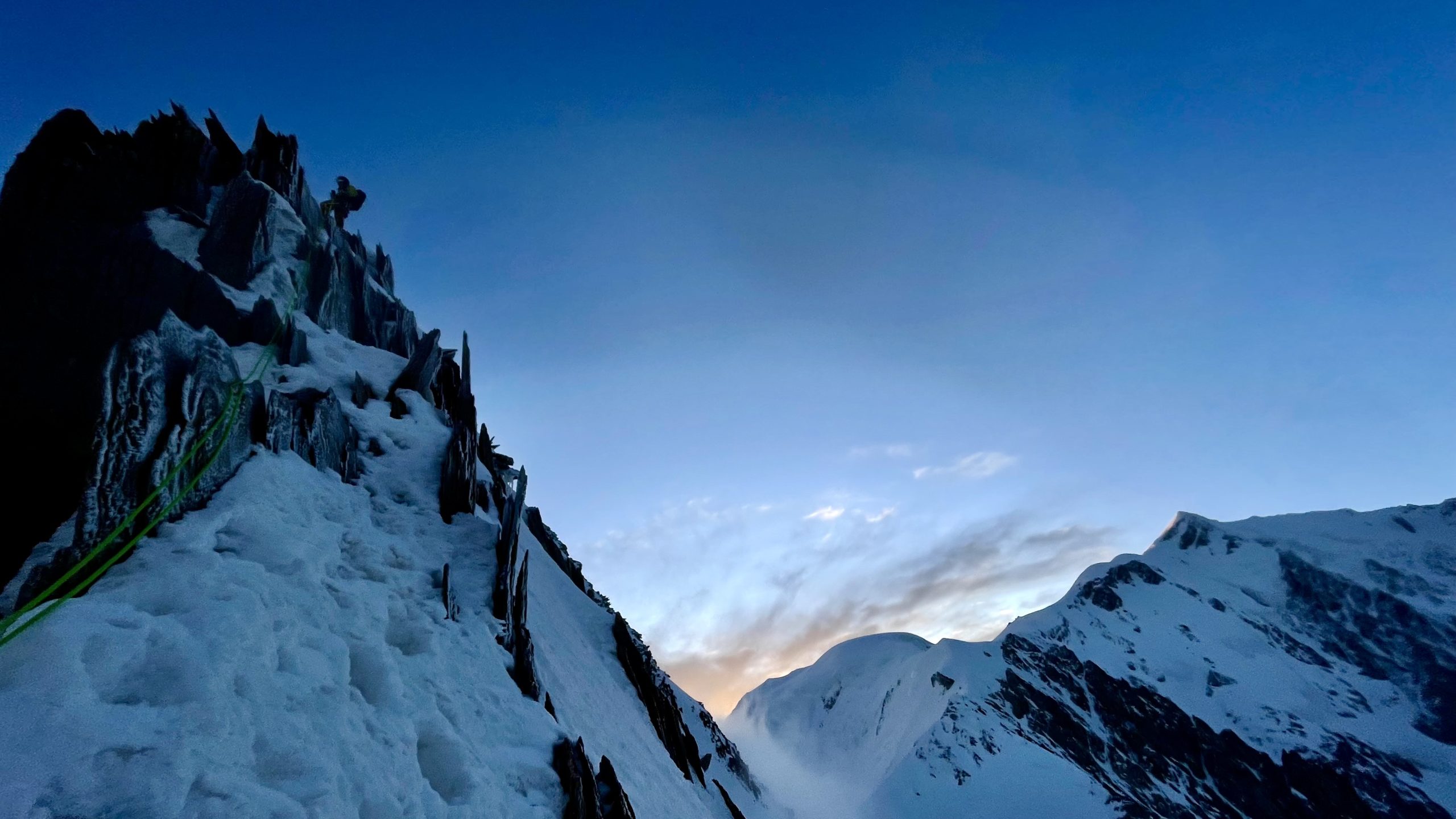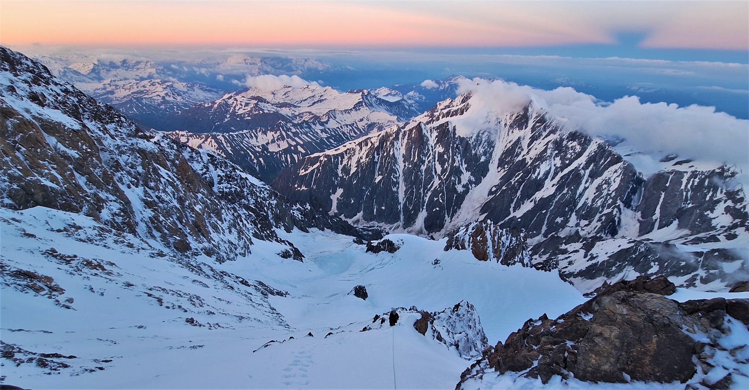 Les pentes au d’accès à l’éperon sont en très bonnes conditions et nous parvenons vite à l’éperon vers 4000 m. Nous sommes en train d’exploser le taux ascensionnel horaire que nous avions envisagé (175 m/h). Les premières lueurs sont l’occasion de faire nos premières photos.
