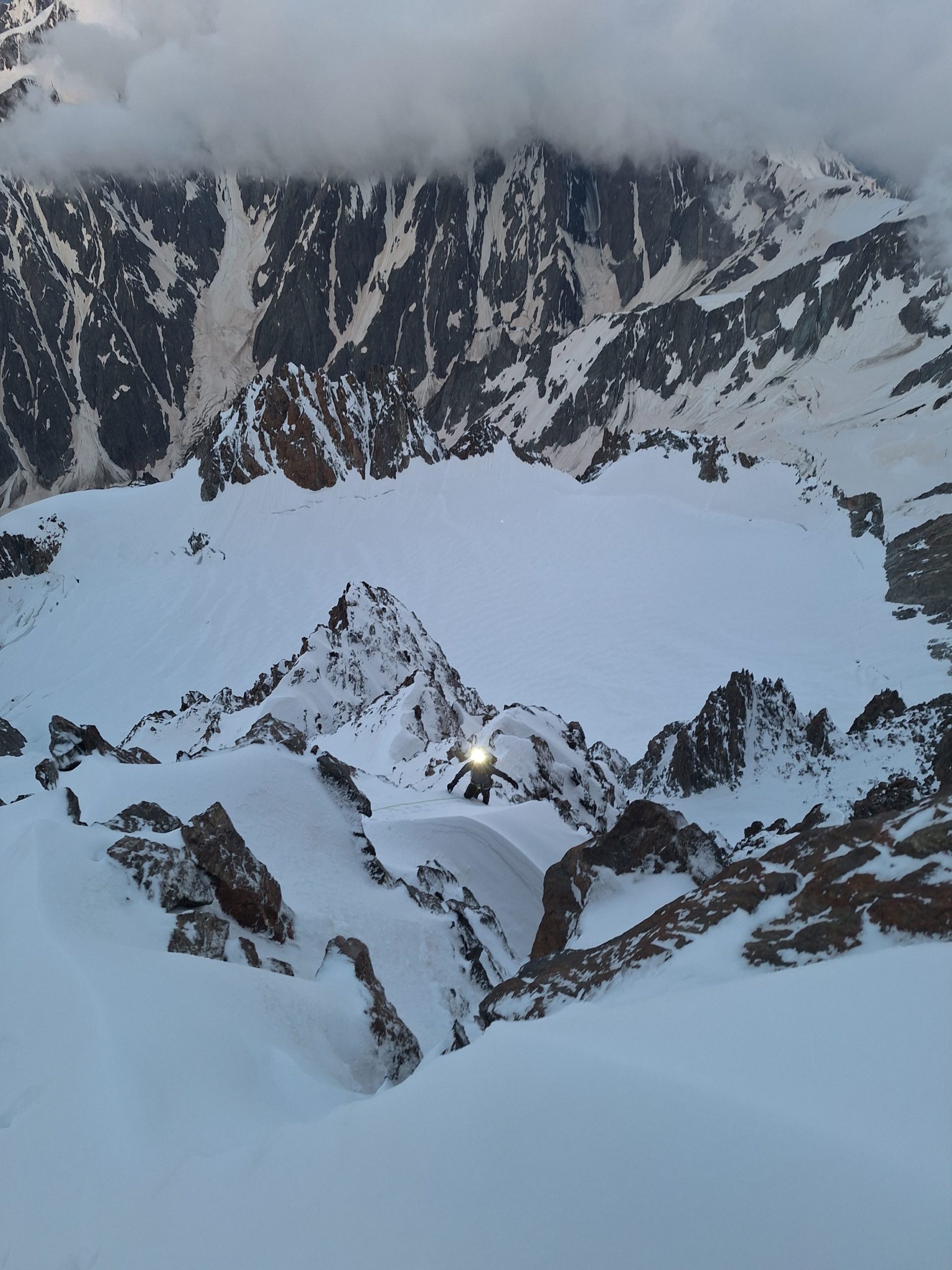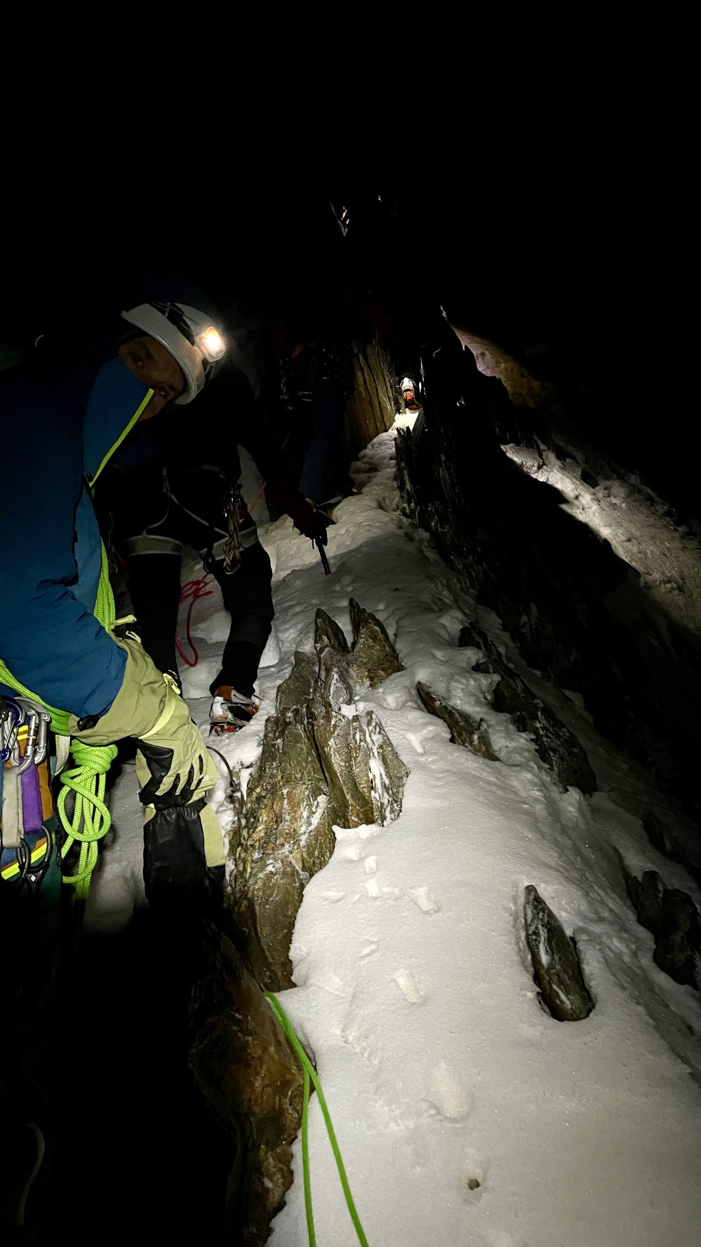 Dès que nous sortons de nos bannettes, nous sommes attentifs à tous les indices : nuit clair, neige recaillée, aucuns bruits de coulée, etc. Vers 00h45, nous sommes prêts et sereins pour nous lancer dans le couloir. La neige y est profonde et c’est physique mais nous nous sentons en sécurité et progressons relativement bien.