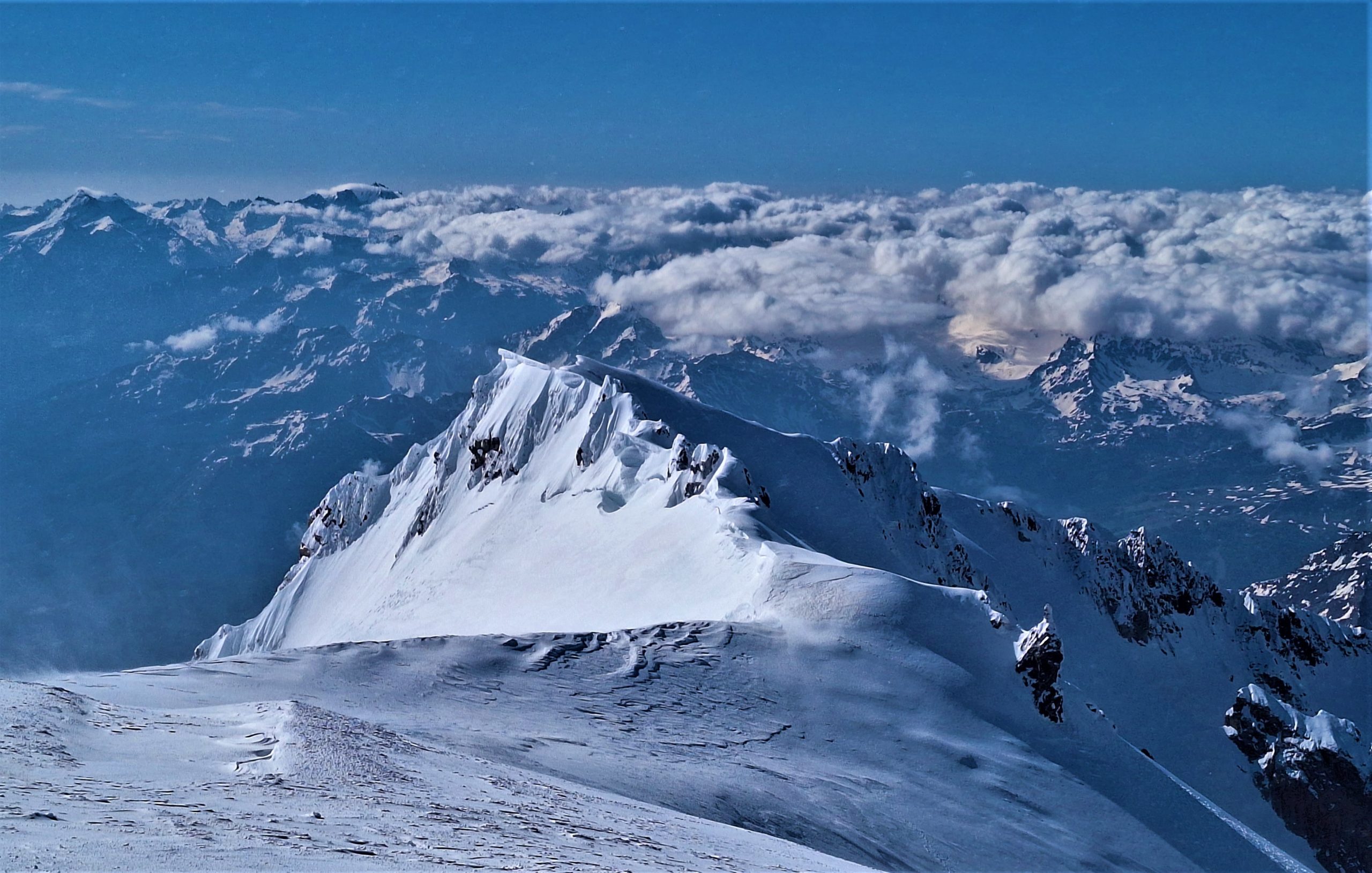 La neige est bien présente encore sur le caillou, cela rend l’escalade très esthétique mais aussi plus technique et nous gardons les crampons. Nous voilà au dessus des nuages alors que nous nous élevons vers le ciel.