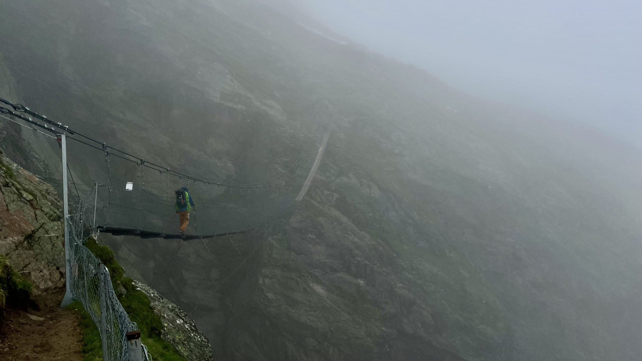 Plus haut, la choucroute s’épaissit et nous traversons la jolie passerelle avec la visibilité des grands jours.