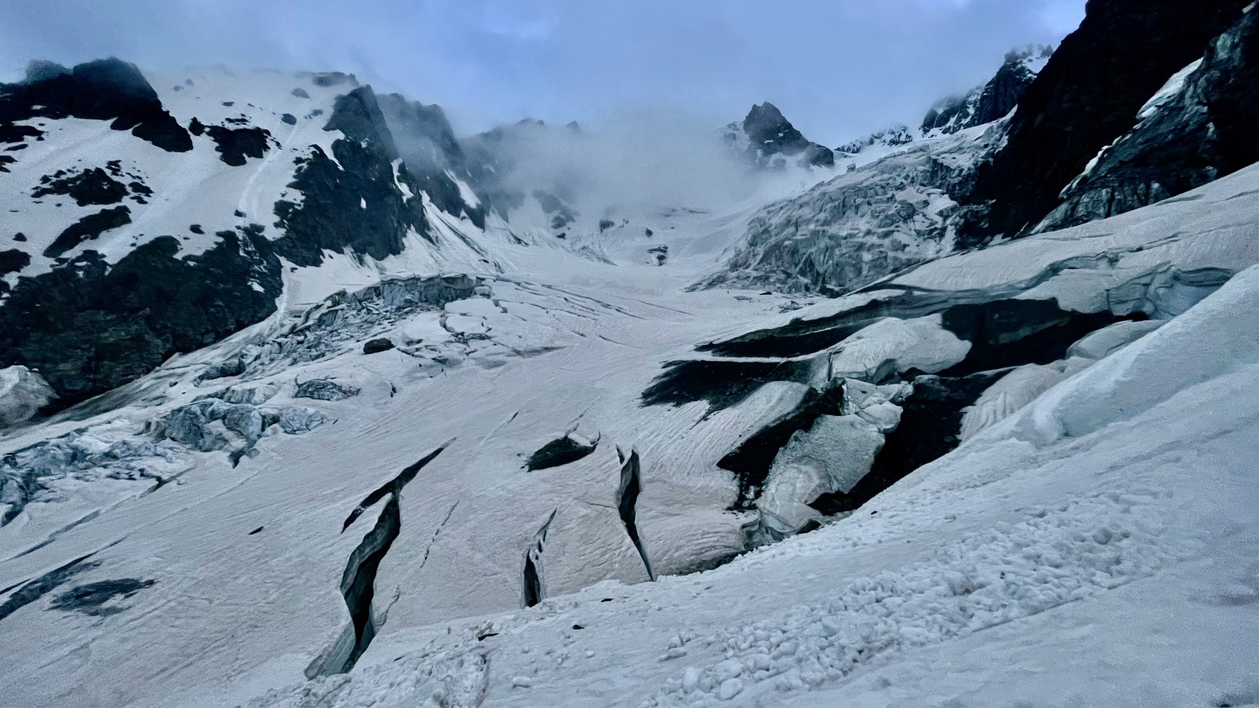 La traversée du glacier du Dôme est une expérience, on louvoie entre de belles crevasses et l’on passe en face d’un dégueuloir bien abo. En réalité, le passage n’est objectivement pas très exposé car nous profitons d’un renflement de la langue glaciaire centrale et de crevasses béantes qui engloutissent tous les efforts de la gravité.