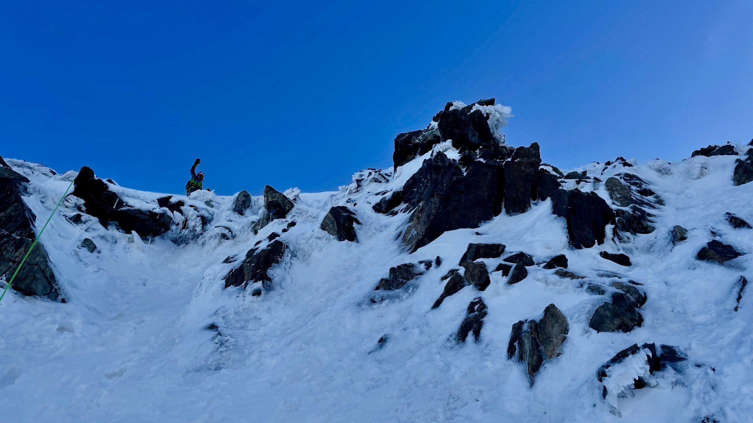 Il faut activer le mode combat pour sortir sur l’arête sommitale. Le ressaut final est méga givré et nous impose de sortir dans des goulottes difficiles à protéger de manière conventionnelle… On apprécie le 2ème piolet.
