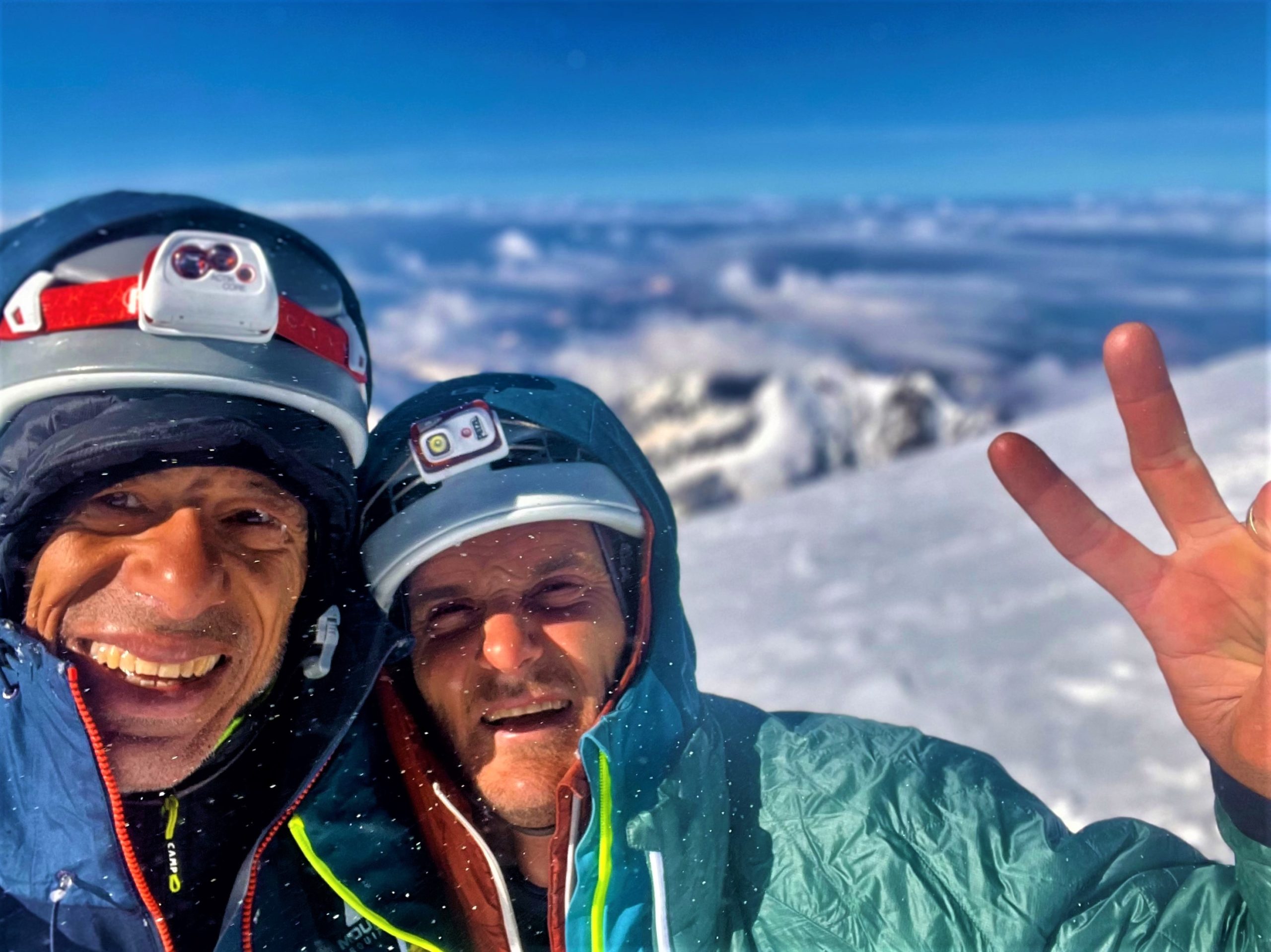 9h, 4700 m, nous sortons enfin sur l’arête des bosses et les premiers rayons de soleil du jour qui nous lèchent la face sont les bienvenus pour faire fondre le givre qui a pris sur nos cils … Ce dernier ressaut est court mais nous aura bien donné du fil à retordre.