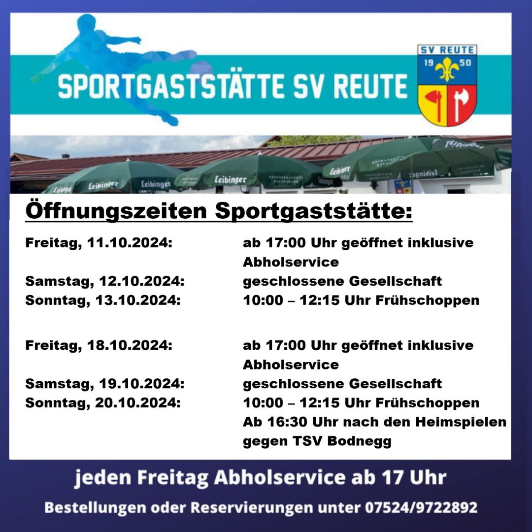 Die Sportgaststätte SV Reute hat diese Woche Freitagabend ab 17 Uhr inklusive dem Abholservice für überbackene Seelen und Wurstsalate sowie zum Frühschoppen am Sonntag geöffnet. Samstag ist aufgrund der Länderspielpause keine Sky-Bundesligakonferenz. Weitere Infos unter 07524/9722892.