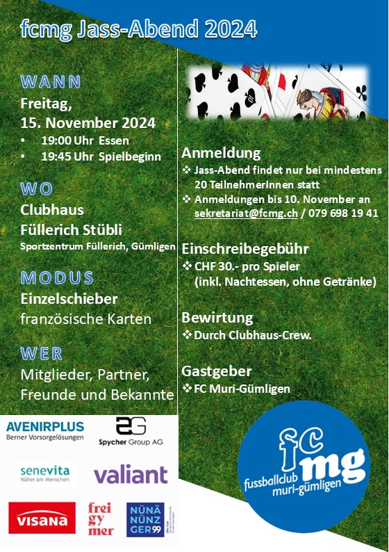 Am Freitagabend, 15. November 2024, ab 19.00 Uhr, findet wiederum unser traditioneller FCMG Jass-Abend im Clubhaus „Füllerich Stübli“ statt. Gastgeber ist der FC Muri-Gümligen. In der Startgebühr von Fr. 30.- ist das von unserer Clubhaus-Crew servierte Nachtessen (ohne Getränke) inbegriffen!