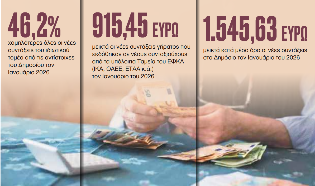 - Κατά 46,2% χαμηλότερες όλες οι νέες συντάξεις του ιδιωτικού τομέα από τις αντίστοιχες του Δημοσίου τον Ιανουάριο 2026.