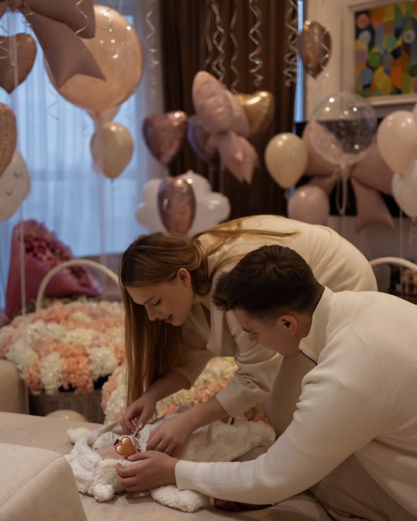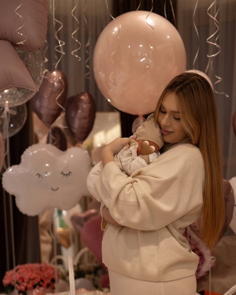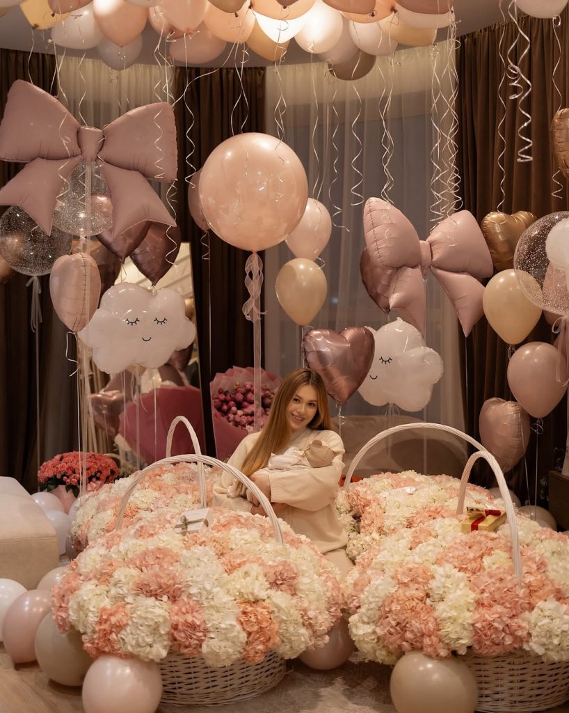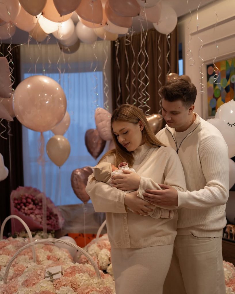 На снимках родители нежно прижимают малышку к себе, а атмосфера вокруг напоминает праздничную встречу долгожданного чуда. В комнате множество цветов, воздушных шаров и уютный мягкий свет – ощущение настоящего домашнего тепла.