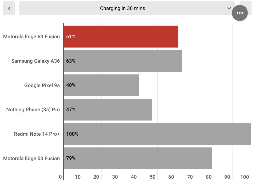 Поддерживается проводная зарядка мощностью 68 Вт. Это не рекорд для Motorola (Pro-версия поддерживает 90 Вт), но все равно очень быстро. Зарядного устройства в комплекте нет, но с помощью стороннего адаптера на 90 Вт я зарядил телефон с 0 до более 60% за 30 минут. Motorola заявляет, что 15 минут зарядки хватит на целый день — возможно, при экономном использовании, но наличие быстрой зарядки в этом классе радует. Беспроводной зарядки нет.