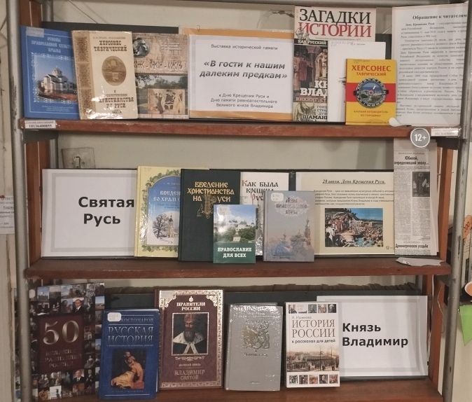К этому праздничному событию в библиотеке-филиале № 7 им Т. Г. Шевченко г. Симферополя открылась выставка «В гости к нашим далеким предкам». В разделе «Князь Владимир» предложены книги с описанием биографии князя Владимира Святославовича, это такие издания как: «Русская история в жизнеописаниях» Н. И. Костомарова, «Владимир Святой (Красное Солнышко)» Д. М. Володихина , «История в жизнеописаниях» Н. Ф. Котляра . Крещение Руси имело неоспоримое историческое, культурное, экономическое и просветительское значение для будущего страны. События тех далеких лет, когда проходило становление христианства, можно изучить в разделе «Святая Русь». Особой гордостью для православных крымчан является колыбель русского Православия – Херсонес. Грандиозный проект по возрождению этого античного города стал символом веры и нашей государственности.