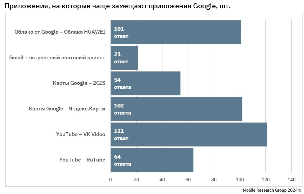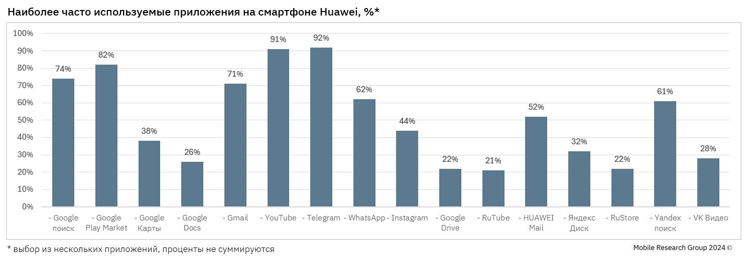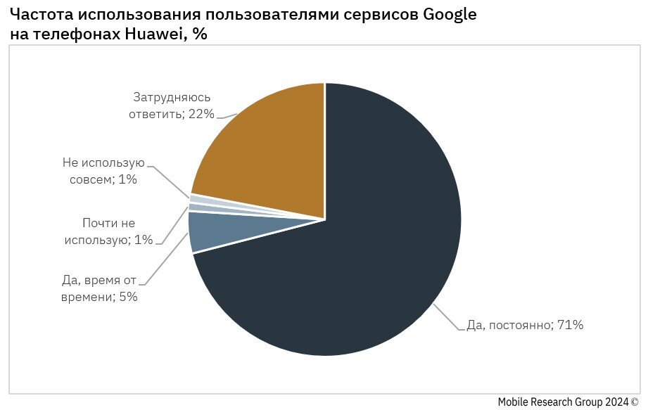 Аналитическая компания Mobile Research Group провела исследование по использованию в России сервисов и приложений Google на смартфонах Huawei. Его результаты показали, что 71% владельцев этих гаджетов постоянно пользуются сервисами и приложениями Google (YouTube, Gmail, Google Play), несмотря на отсутствие Google Mobile Services (GMS).