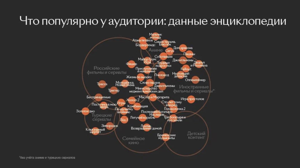 - 87% от аудитории смотрит российский контент (78% у сериалов из России); Проекты из списка 122 «миллионеров» в среднем представлены на 4 разных площадках (у «Маши и медведя» — 13 площадок); Аудитория детского и семейного контента выросла в 2024 году (35% от всех подписчиков смотрят подобные проекты); Одна из главных тенденций года у онлайн-кинотеатров — упор на большие премьеры и замедление темпа роста аудитории; Большую роль играет система рекомендаций; Значительная часть российских фильмов обычно становится доступна на стриминге после восьми недель проката; 2,8 млн домохозяйства без доступа к кинотеатрам посмотрели фильмы и сериалы на «Кинопоиске» в 2024 году (88% аудитории видела хотя бы один фильм за год); В 2024 году фильмы в прокате начали получать поддержку «Кинопоиска» («Руки Вверх!», «Анора», «Огниво», «Волшебник Изумрудного города»). Продажи билетов в кино через «Кинопоиск» и «Яндекс Афишу» за год выросли на 42%, а общие продажи билетов в России — на 7%.