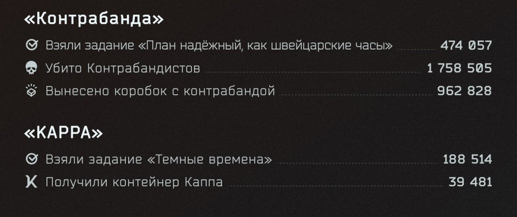 За время патча в Escape from Tarkov прошло множество ивентов. Например, совсем недавно можно было получить редкий контейнер Kappa. С задачей смогло справиться почти 40 тысяч игроков, однако задание, которое приводит к получению контейнера, взяло более 188 тысяч игроков — большинство так и не добралось до желанной цели.
