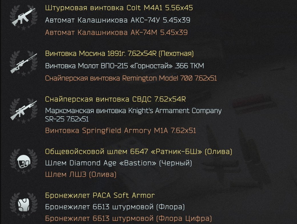 Разработчики перечислили список самого популярного оружия и снаряжения среди игроков ЧВК. Каких-то удивительных экспонатов здесь нет. К примеру, среди штурмовых винтовок наиболее популярной оказалась Colt M4A1, тогда как следом следуют два «Калаша». АКС-74У и АК-74М заняли второе и третье места соответственно.
