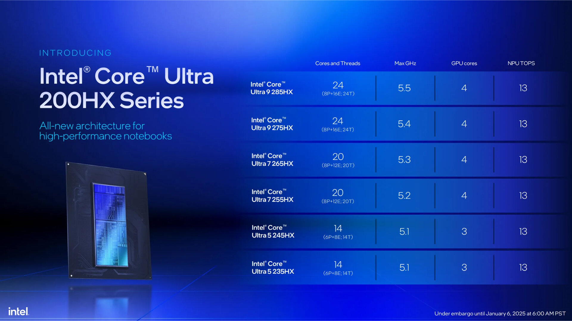 Мобильные процессоры Core Ultra 200HX/200H созданы для следующего поколения геймеров и профессиональных создателей контента, согласно Intel. В серии HX может быть до 24 ядер (восемь производительных P-ядер и 16 эффективных E-ядер), в серии H — до 16 ядер (шесть P-ядер, восемь E-ядер и два маломощных E-ядра). Флагманский Core Ultra 200HX получил нейронный процессор на 13 TOPS, имеет 48 линий PCIe (как PCIe 4.0, так и 5.0) и в многопоточной производительности на 41% превосходит предыдущее поколение. Общий показатель ИИ-вычислений достигает 99 TOPS при одновременном использовании графического (ГПУ), центрального (ЦПУ) и нейронного (НПУ) процессоров. Конструкция чипа уменьшена на 33%.