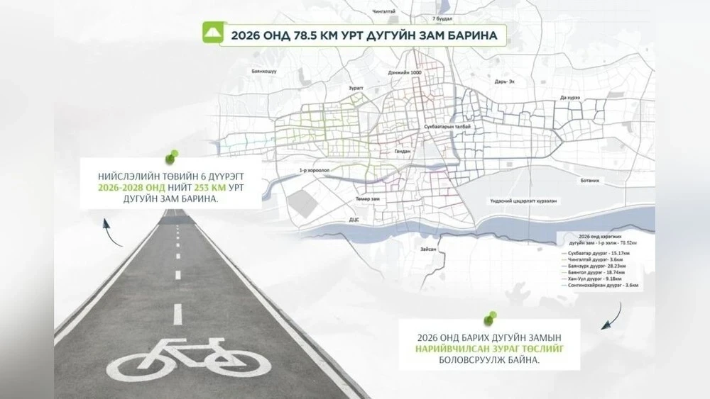 В рамках этих планов завершено детальное проектирование 78.5 километров велосипедных дорожек, которые должны быть построены в 2026 году. Конкретно, в районе Сухбаатар будет построено 15.17 км, в Чингэлтэе — 3.6 км, в Баянзурхе — 28.23 км, в Баянголе — 18.74 км, в Хан-Ууле — 9.18 км и в Сонгинохайрхане — 3.6 км. В настоящее время в Улан-Баторе уже существует 101.7 км велодорожек, и в соответствии с концепцией «Город 20 минут», к 2040 году их общая протяженность планируется увеличить до 1677 км. Новые велодорожки будут полностью отделены от автомобильного движения и интегрированы в зеленые зоны города.