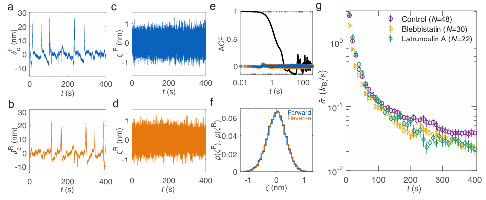 Остановка моторов и обновления каркаса стирает стрелу времени. (a)-(b) «Кино» движения зонда: реальная запись колебаний во времени (a) и та же запись, прокрученная задом наперед (b). (c)-(d) Очищенные данные. Ученые убрали предсказуемые повторения из сигналов, чтобы оставить только случайный шум. Сравнение этого шума «вперед» и «назад» позволяет найти скрытую асимметрию времени. (e) Технический график автокорреляции. Он подтверждает, что после обработки данные стали «белым шумом» (случайным и независимым), что необходимо для корректности расчетов. (f) Распределения вероятностей. Синяя линия — прямой ход времени. Оранжевая линия — обратный ход. Если бы система была в равновесии, эти кривые совпали бы идеально. Их расхождение — это визуальное доказательство необратимости времени. (g) Итоговый результат: Мера необратимости времени (сигма) в зависимости от длительности наблюдения. Фиолетовые круги (Контроль): Высокие значения. В нормальной клетке время течет строго в одном направлении. Зеленые и желтые значки (Лекарства): Значения резко падают вниз. Вывод: При блокировке моторов (Блеббистатин) или обновления каркаса (Латрункулин), движения внутри клетки становятся почти симметричными во времени. Клетка начинает вести себя как неживая материя, теряя свою временнýю направленность. Статистические тесты подтверждают: это не случайность, а закономерность. arXiv:2503.17016 [physics.bio-ph]