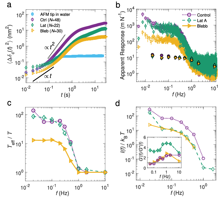 Высокая эффективная температура как индикатор активности клетки. (a) График интенсивности колебаний зонда (среднеквадратичное смещение). Фиолетовые круги: обычная делящаяся клетка (контроль) — максимальная подвижность. Желтые треугольники: клетка с отключенными моторами (Блеббистатин). Зеленые ромбы: клетка с остановленным обновлением каркаса (Латрункулин-А). Видно, что любое химическое вмешательство снижает размах движений по сравнению с нормой. (b) График отклонения от равновесия. В обычной «неживой» физике пустые и закрашенные символы должны совпадать. Здесь виден огромный разрыв между ними — это математическое доказательство того, что система находится в активном, неравновесном состоянии. (c) Эффективная температура. График показывает, во сколько раз «шум» внутри клетки превышает обычную комнатную температуру. Обратите внимание: даже при воздействии лекарств (зеленые и желтые линии) на низких частотах температура остается очень высокой, показывая, что внутри все еще «бурлит» активность. (d) График рассеяния энергии (производства энтропии). Здесь видно главное расхождение: для клеток под Латрункулином (зеленые ромбы) потеря энергии падает очень сильно, гораздо ниже контроля. При этом на графике (c) их температура была почти такой же высокой. Врезка (маленький график): Показывает отношение упругости к вязкости. Она объясняет парадокс: под действием Латрункулина оболочка клетки становится более жесткой (твердой), поэтому она меньше тратит энергию впустую, но при этом сохраняет высокий уровень шума. arXiv:2503.17016 [physics.bio-ph]