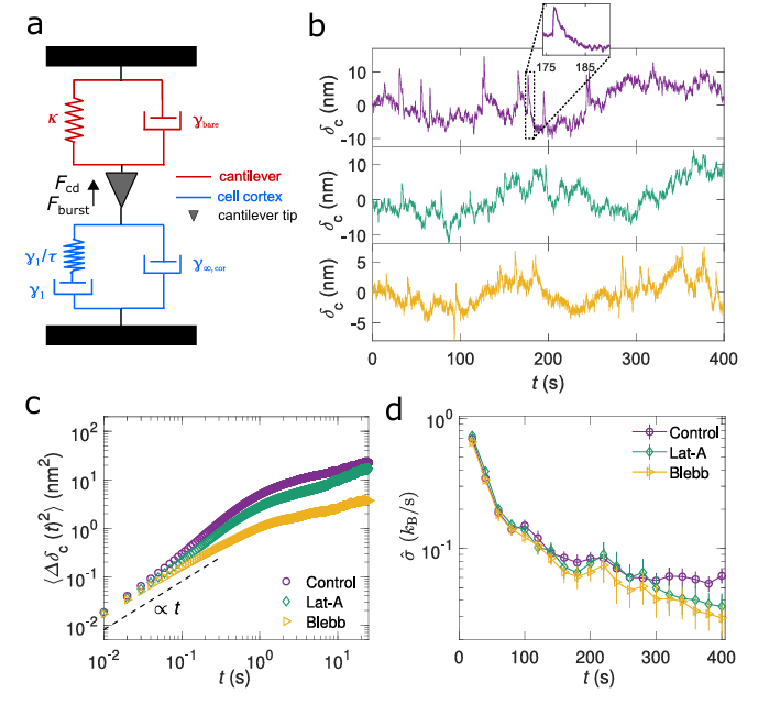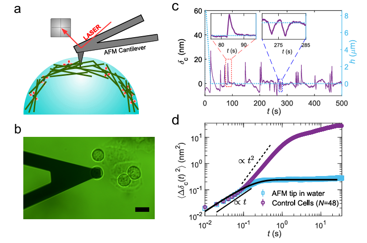 Изучение активных колебаний клеточной оболочки с помощью атомно-силового микроскопа (АСМ). (a) Схема эксперимента: зеленым показаны полимеры актина (каркас клетки), красным — моторные белки, создающие напряжение. (b) Вид под микроскопом (снизу): зонд АСМ погружен в оболочку (кортекс) клетки HeLa, застывшей в стадии деления. Масштабная линейка: 20 мкм. (c) Слева: График колебаний положения наконечника зонда δ_c( t ) внутри клетки. Левая врезка: Увеличенный вид активного «всплеска» силы, направленного наружу. Виден резкий скачок вверх и более плавный спад — эта асимметрия указывает на необратимость времени. Правая врезка: Всплеск силы, направленный внутрь клетки — он имеет почти симметричную форму. (d) График активности (среднеквадратичное смещение). Фиолетовые круги показывают сильные колебания зонда внутри живой клетки. Синие квадраты — слабые колебания зонда просто в воде. Черная линия — теоретическая модель. arXiv:2503.17016 [physics.bio-ph]