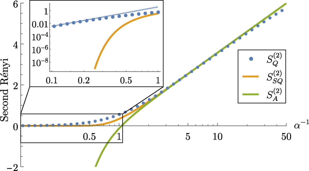 Сравнение полузакаленной, отожженной и закаленной энтропий Реньи в области границы Эйри, где β = αe^(2S₀/3) (при γ = 1). Полузакаленная и отожженная энтропии рассчитаны аналитически (по формулам), а закаленная — численным методом. На врезке видно различие при низких температурах: закаленная энтропия спадает по степенному закону α⁻³ (синяя пунктирная линия), тогда как полузакаленная убывает экспоненциально. В отличие от отожженной энтропии, оба этих варианта всегда остаются положительными.