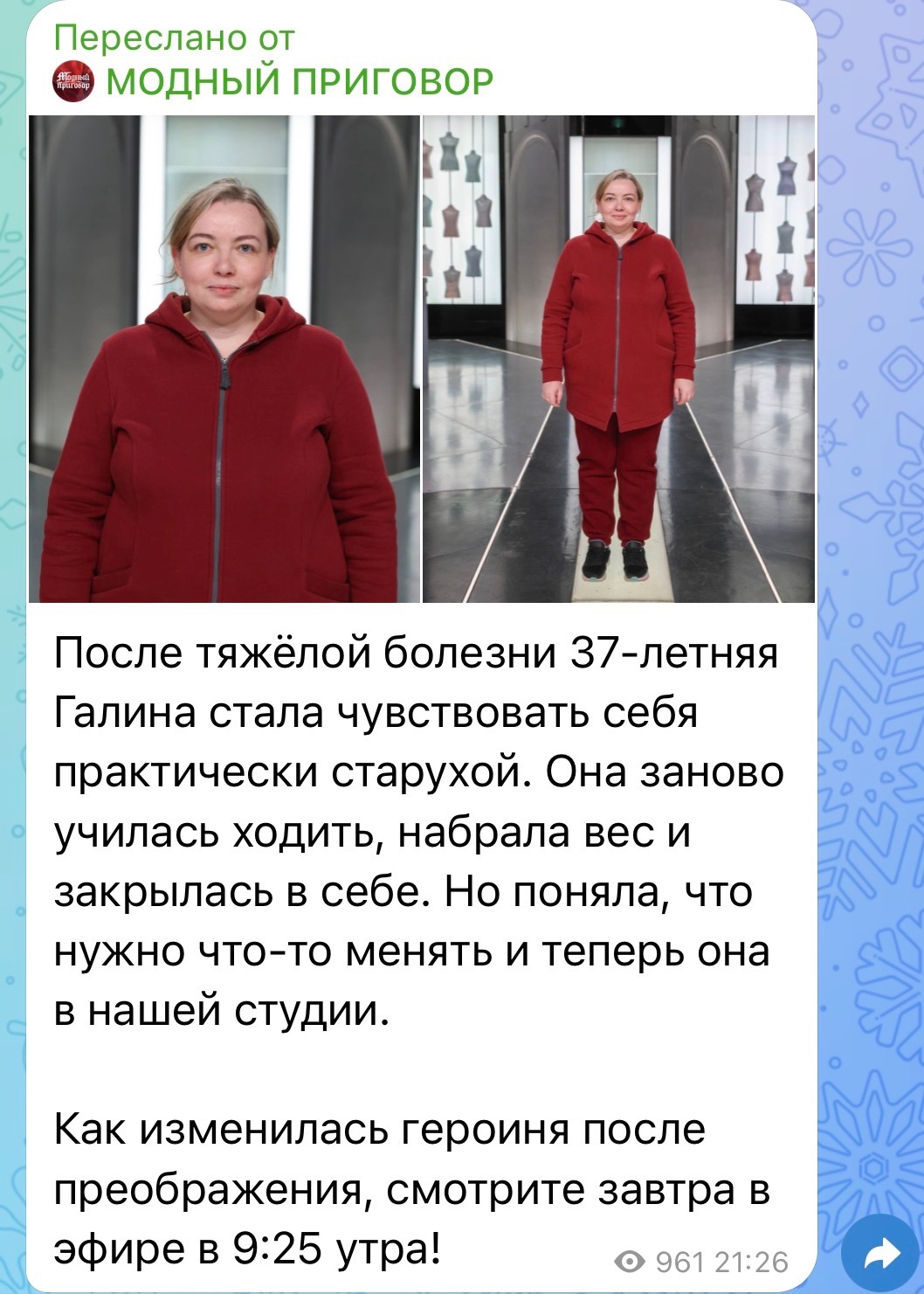Выпуск с ее участием вышел в эфир 27 февраля 2026 года. На съемках женщину поддерживали дочь и муж, а после эфира Галина написала в соцсети: «Сама себе не верю».