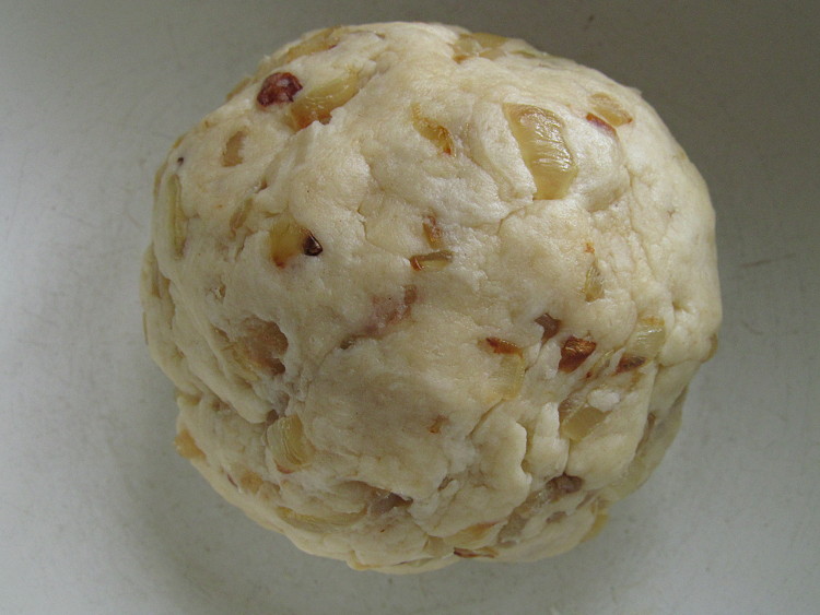 Муку смешать с разрыхлителем, солью и размягченным маслом. Добавить молоко, обжаренный лук и замесить тесто.