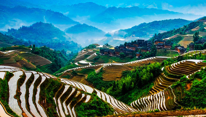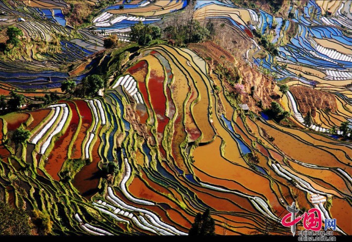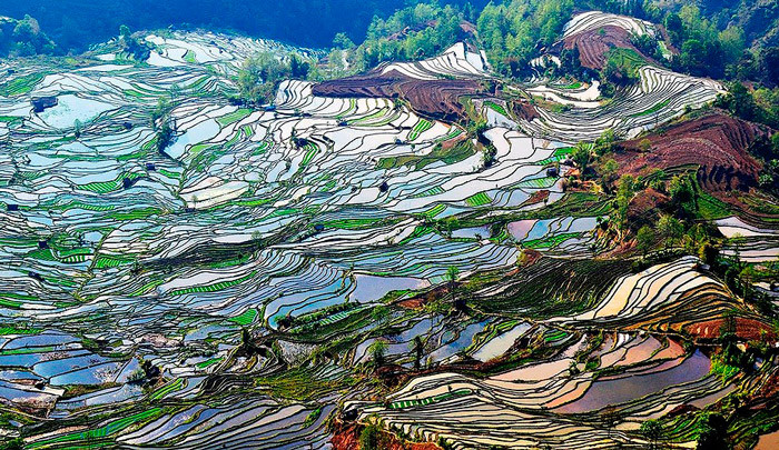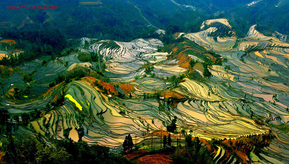Рисовые террасы Юньнань были созданы сотни лет назад, когда жители области раскапывали участки гор для посадки риса. Так и были созданы эти искусственные поля, которые выделяются своей широкой цветовой гаммой. Кроме того, культурное богатство этой провинции неоценимо. В ней проживает наибольшее число этнических меньшинств в стране: из 56 этнических групп, существующих в стране, Юньнань является родиной для 25. Поэтому только здесь можно найти останки пиктографического письма самых древних воинских групп в Южной Азии. Это место стало одним из отправных пунктов для путешественников в Тибет.