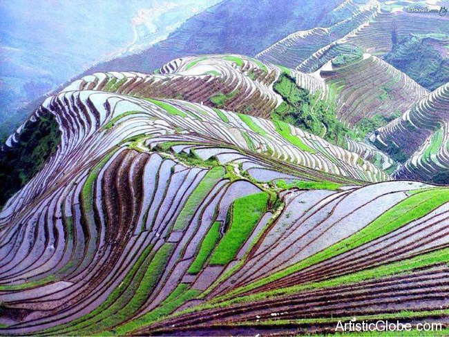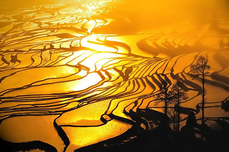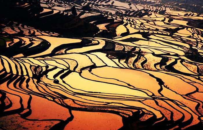 Результатом импровизированного расположения покрытых водой террас является пейзаж, который выглядит как абстрактная живопись. Человек создал, а туман, солнце и красочные цвета делают остальную часть работы, обеспечивая потрясающие панорамы. Разнообразие фактур и палитр террас Юньнань меняется в зависимости от времени суток и года. Создано этнической группой Хани, место является одним из самых известных пейзажей южного Китая. Но, несмотря на столь большую красоту и уникальность, оно все еще не испорчено современным туризмом, так как регион довольно труднодоступный, без ближайшего аэропорта и с плохими дорогами.