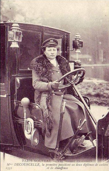 Мадам Decourcelle — первая женщина–водитель такси в Париже, 1908 .