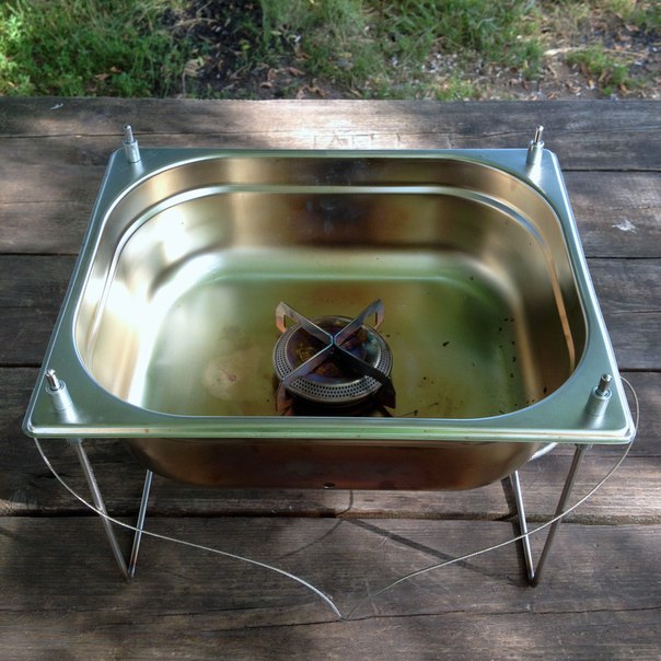 Самодельная печь (дрова, уголь, газ) изготовлена из нержавеющих гастроемкостей размера 1/2: из двух емкостей глубиной 15 см сделан мангал-очаг, ветрозащитный фартук и поддон, из двух емкостей глубиной 10 см сделана духовка-коптильня и газовый кожух, емкость глубиной 6,5 см является крышкой и сковородой.