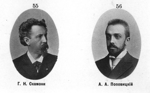 36-летний Поповицкий Александр Александрович – самый молодой на этой фотографии. Он родился 13 июня в 1868 году, образование получил в Санкт-Петербургском университете, в Экспедицию заготовления государственных бумаг поступил в должности старшего мастера в 1892 году. В Поповицком счастливо соединились умелый изобретатель и энергичный исследователь. Он написал несколько научных работ по фотографии, среди которых «Трехцветная фотография и трехкрасочная печать» и «О жидких светофильтрах и о применении их в области ортохроматической фотографии». Поповицкий изобрел оригинальную фотографическую камеру, в которой оптическая система линз была заменена отражательными зеркалами. В 1904 году он получил патент на свое изобретение. Ещё он разработал зеркальные объективы для обычных фотокамер. После ухода с должности Г.Н. Скамони А.А. Поповицкий возглавил фотографическое отделение. Под его руководством фотомастерские Экспедиции добились больших успехов и смогли начать выполнять самые сложные заказы в виде высокохудожественных изданий и хорошо защищенных от подделок государственных бумаг. Особо следует отметить судебно-экспертную деятельность А.А. Поповицкого в области исследования документов и судебной фотографии. На основе своего экспертного опыта он разработал в 1908 году классификацию элементов (признаков), характеризующих особенности почерка. Из ЭЗГБ Поповицкий уволился в 1918 году после 26 лет работы здесь, чтобы стать первым директором созданного в Петрограде Высшего института фотографии и фототехники.