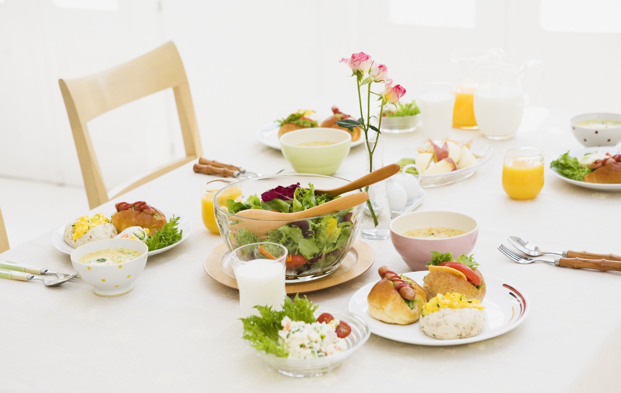 Сервировка стола к завтраку: простая стеклянная посуда, деревянные приборы и белоснежная скатерть. Свежие цветы всегда к месту, стол к завтраку можно украсить ими в небольшом количестве