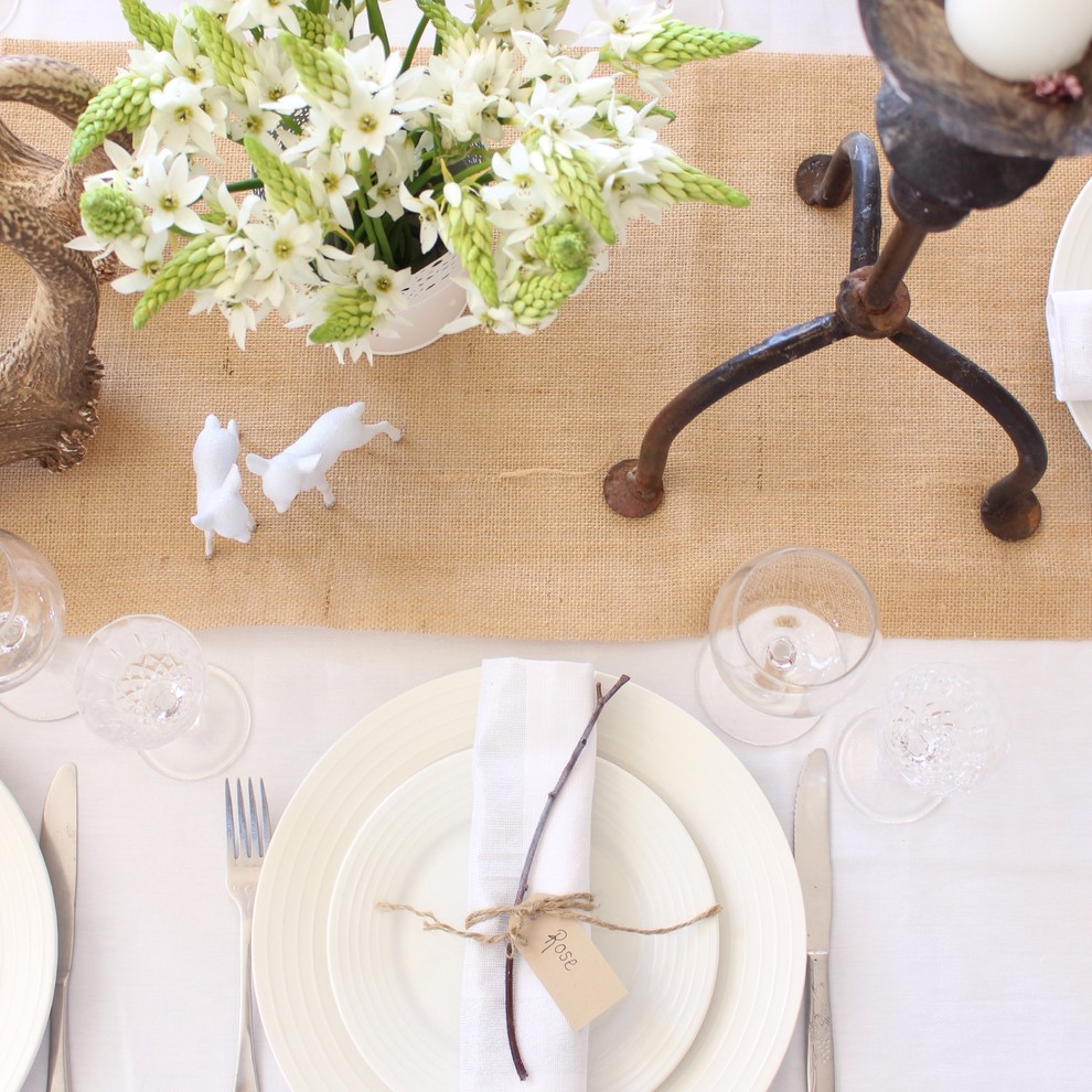 Декор стола лучше всего визуально объединяется с помощью раннера (узкая полоса ткани вдоль стола, вместо традиционной скатерти)