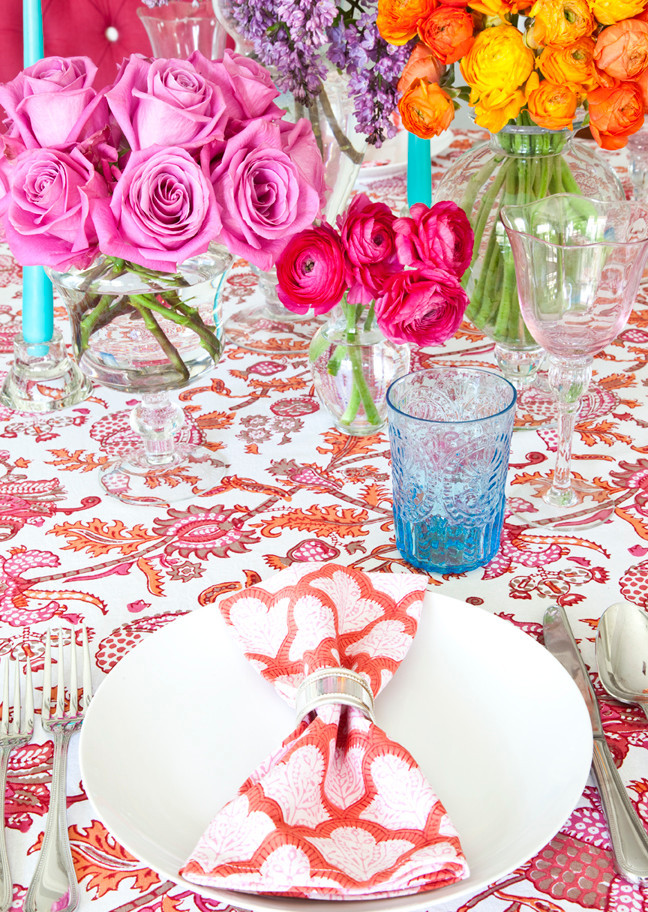 Когда нет строгих требований к церемонии и дресс-кода, центральной темой оформления праздничного стола можно сделать пестрые узоры в столовом текстиле и яркие цвета букетов