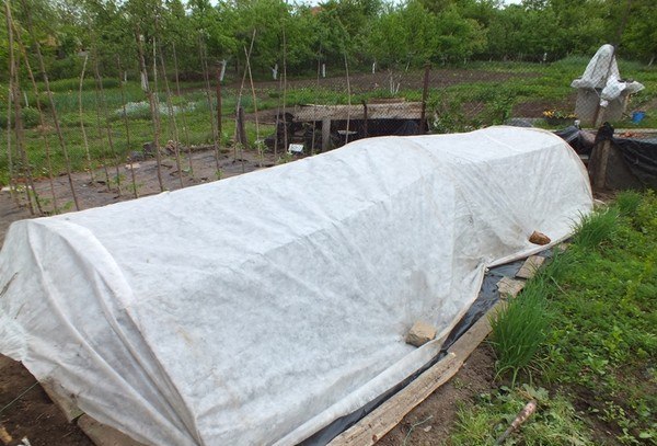 После всех этих приготовлений и подготовок . мы уже накрываем агроволокном белым плотностью 50-80 мкм и закрепляем .
