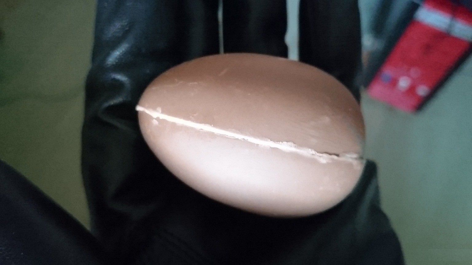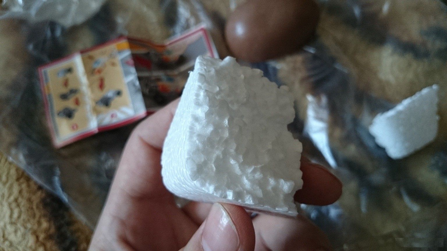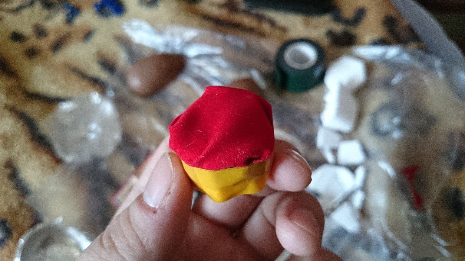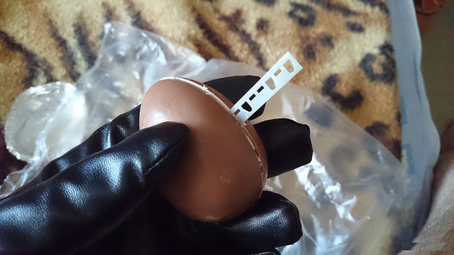 Далее самое трудное - собрать это все вместе. Шоколад я склеивал следующим образом: лезвием ножа нагретом в кипятке нагревал шоколад в местах реза бритвой, проделывается это с обеими половинками. Шоколад застывает довольно долго что дает время все это аккуратно проделать. Далее желтый контейнер кладется внутрь половинок, которые склеиваются. Получается вот так: