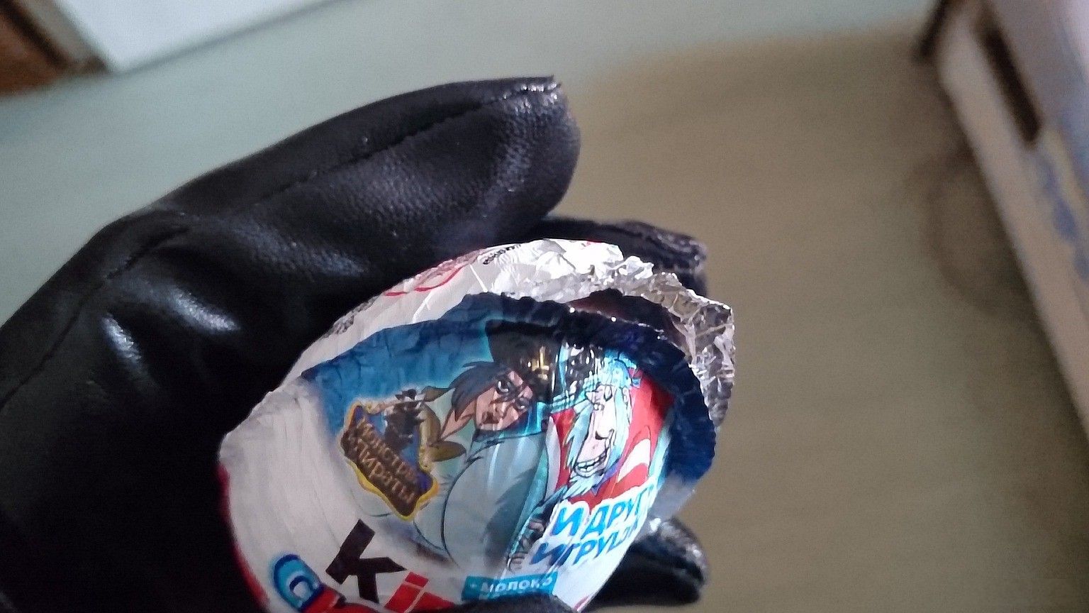 Берем киндер. Аккуратно снимаем с него золотинку. Т.к. киндер нужно будет вернуть в первоначальное состояние делаем все предельно осторожно. Желательно на ту руку в которой лежит киндер одеть теплоизолирующую (обычную, коженую зимнюю) перчатку потому как от тепла рук шоколад киндера очень быстро плавится. Сняв золотинку аккуратно по шву разрезаем шоколад.