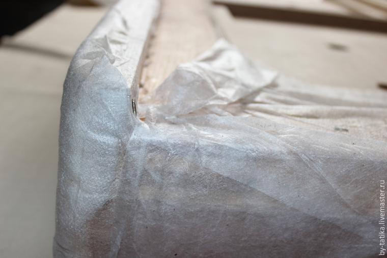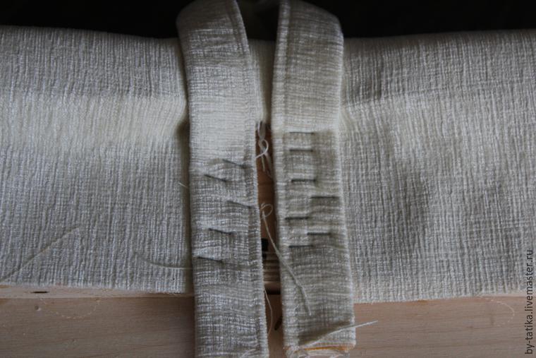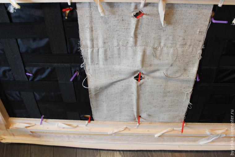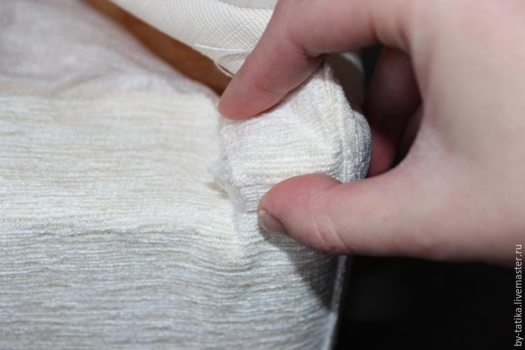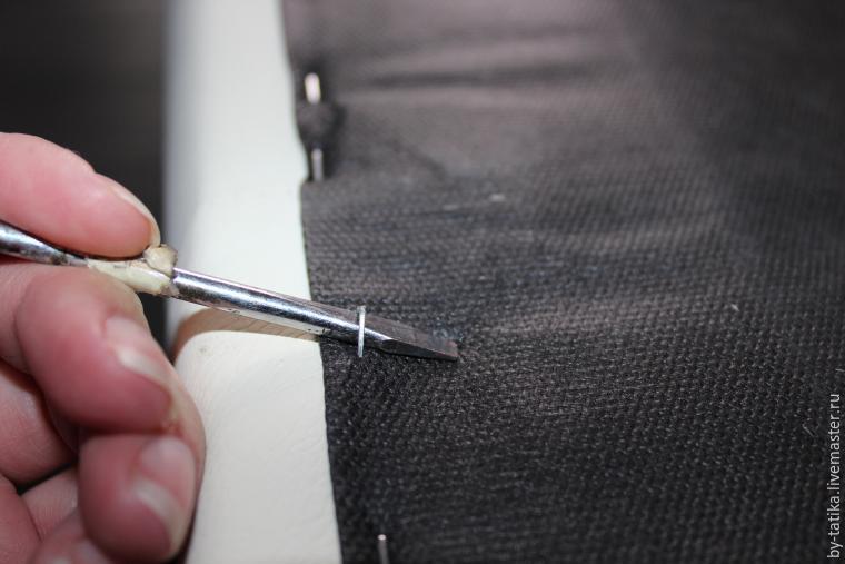 Далее по уже знакомой схеме: углы (для внутреннего угла ткань необходимо разрезать, как в описании отверстия для ручки), примерка, стяжка пуговицами, натяжение, закрепление). При натяжении начинаем с внутреннего угла, чтобы шов "спустился" и его в последствии было не видно.
