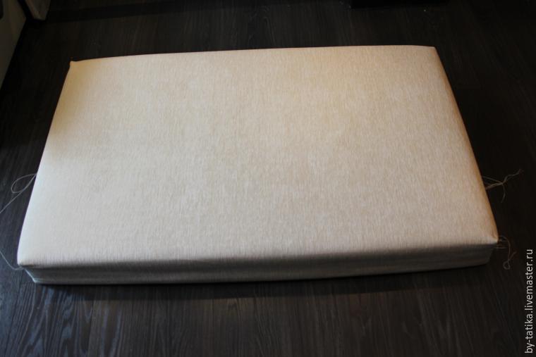 Далее делаем необходимые замеры и вырезаем нужный кусок ткани (по длине: длина подушки + высота подушки*2, по ширине аналогично) с припуском хотя бы по 5 см. с каждой стороны. Размещаем ткань на полу лицом вниз, на нее сверху кладем часть нашего дивана. Необходимо определиться каким образом обрабатывать углы. Либо путем складывания: