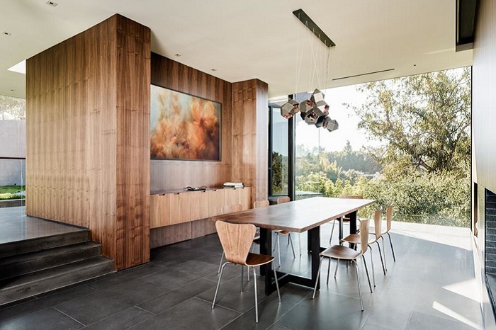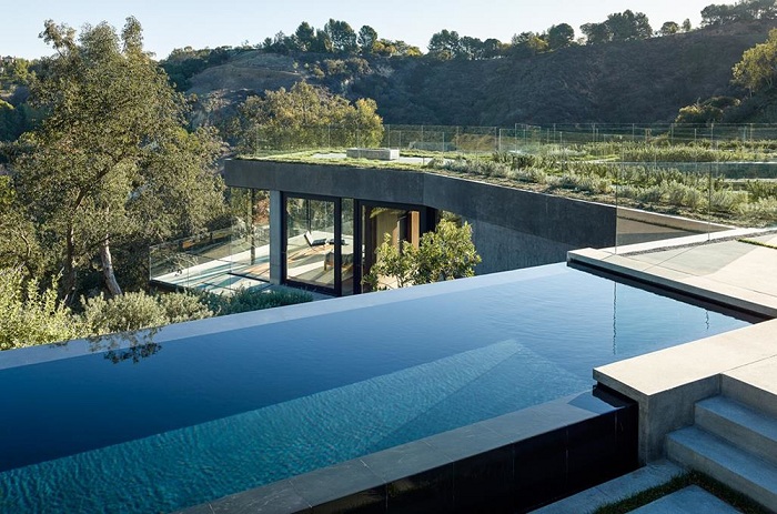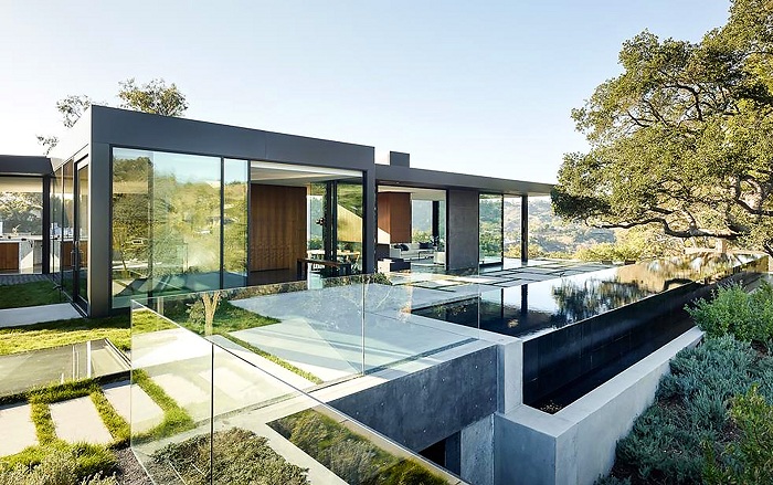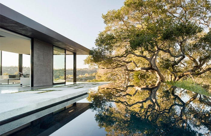 На живописном холмистом склоне расположен потрясающий особняк с прозрачным как стекло бассейном. Реальные размеры дома (740 кв. метров) умело завуалированы за счет нестандартной планировки: часть его скрыта под землей, а фасад покрыт стеклянными раздвижными дверями, отражающими вековые дубы.