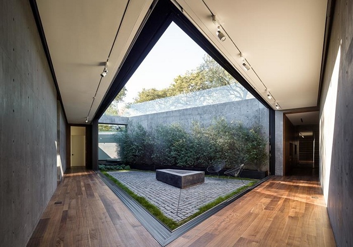 Благодаря жаркому климату, в наземной части дома использовано очень много стекла: практически повсюду стены заменяют широкие прозрачные раздвижные двери. На нижнем уровне, наоборот, преобладает конструкционный бетон, позволяющий сохранить прохладу в самые знойные дни.
