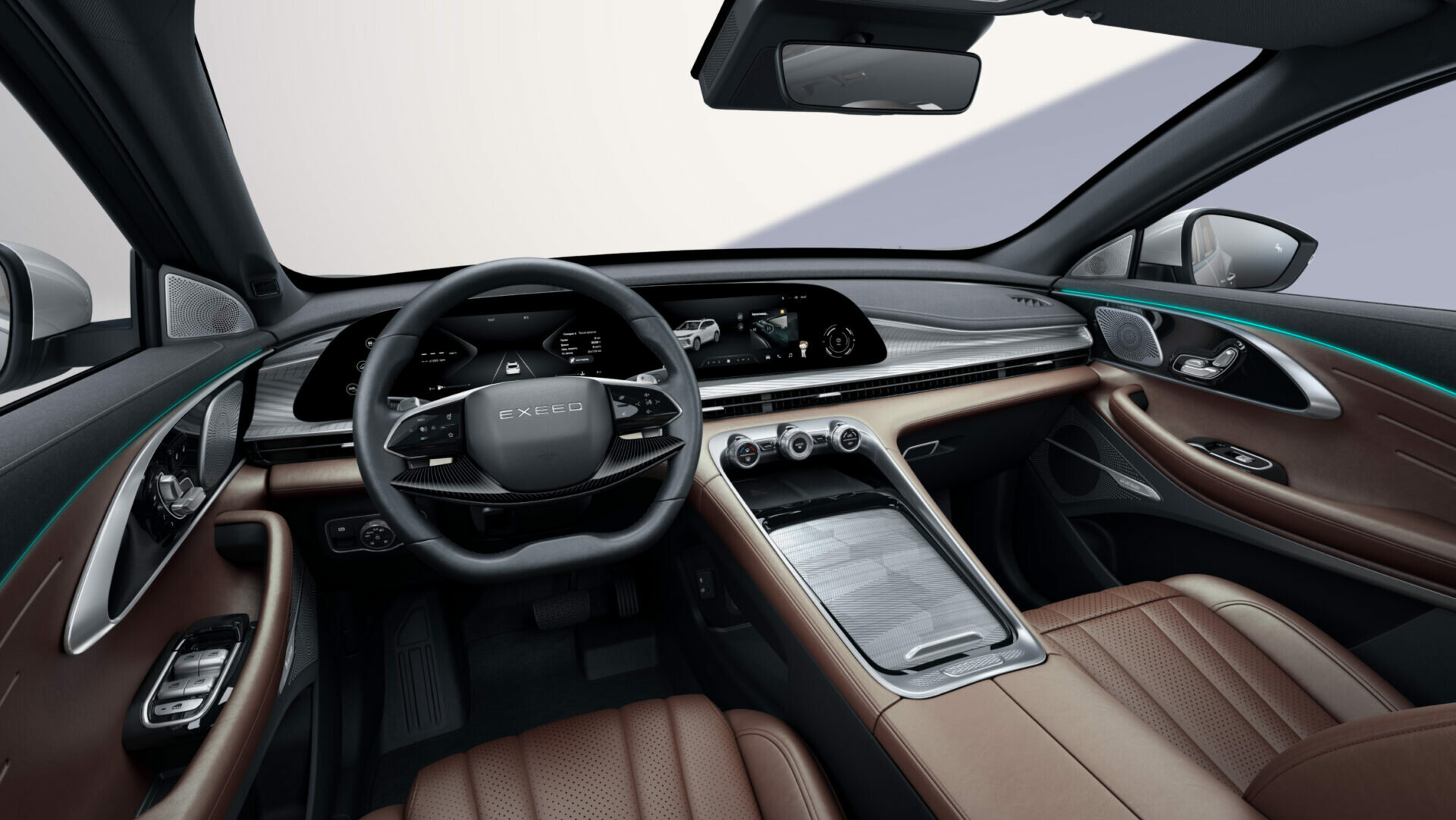 Внешне Exeed TXL 2024 не изменился, чего не скажешь про интерьер. Внутри — новые сиденья, совершенно другая передняя панель, включающая изогнутый сдвоенный экран, мульти-руль с сенсорными кнопками и функцией предотвращения случайного нажатия и переделанные дверные карты. Также есть новая аудиосистема Lion Melody — 23 динамика и активное шумоподавление. Впервые для этой модели производитель предлагает полноценный проекционный дисплей на лобовом стекле, на него выводится текущая скорость, запас хода и навигация. Доступно такое удовольствие в комплектации Flagship. Из других изменений стоит отметить место для беспроводной зарядки на 50 Вт в нише под приборной панелью и кнопки регулировки сидений на дверных панелях. Для большего свободного места рычаг коробки передач переместили с центрального тоннеля на рулевую колонку.