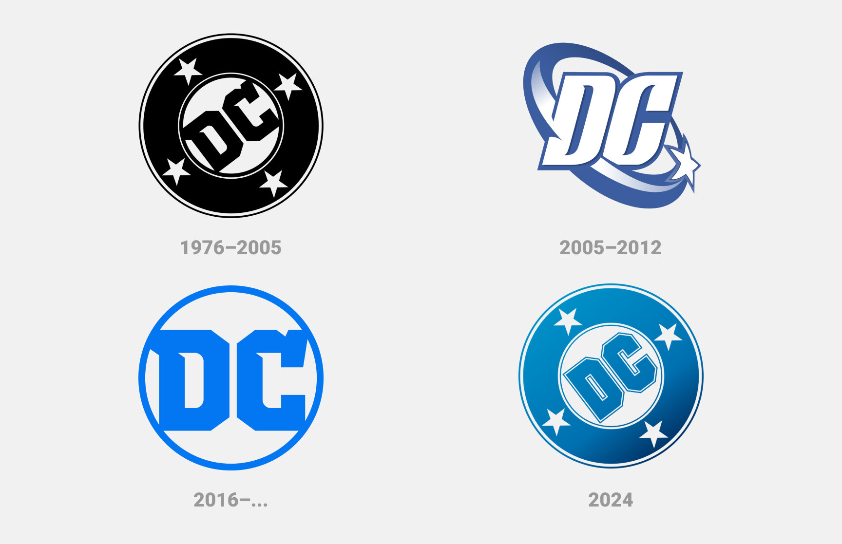 С 1976 года логотип DC представлял собой две чёрные буквы внутри толстого чёрного кольца с четырьмя белыми пятиконечными звёздами под наклоном. В 2005 году логотип сменился на кардинально другой вариант: белую надпись DC с обводкой поместили в синий круг, олицетворяющий след от летящей звезды. В 2016 году после неоднозначного редизайна символика DC вовсе упростилась до блочных букв с использованием тонкого круга без особых замыслов и дополнительных элементов.