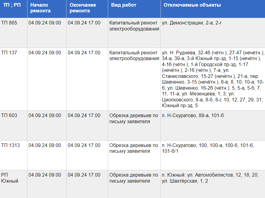 В среду, 4 сентября, по целому ряду адресов в Туле ограничат подачу электричества. Об этом сообщается на официальном сайте АО «Тульские городские электрические сети».