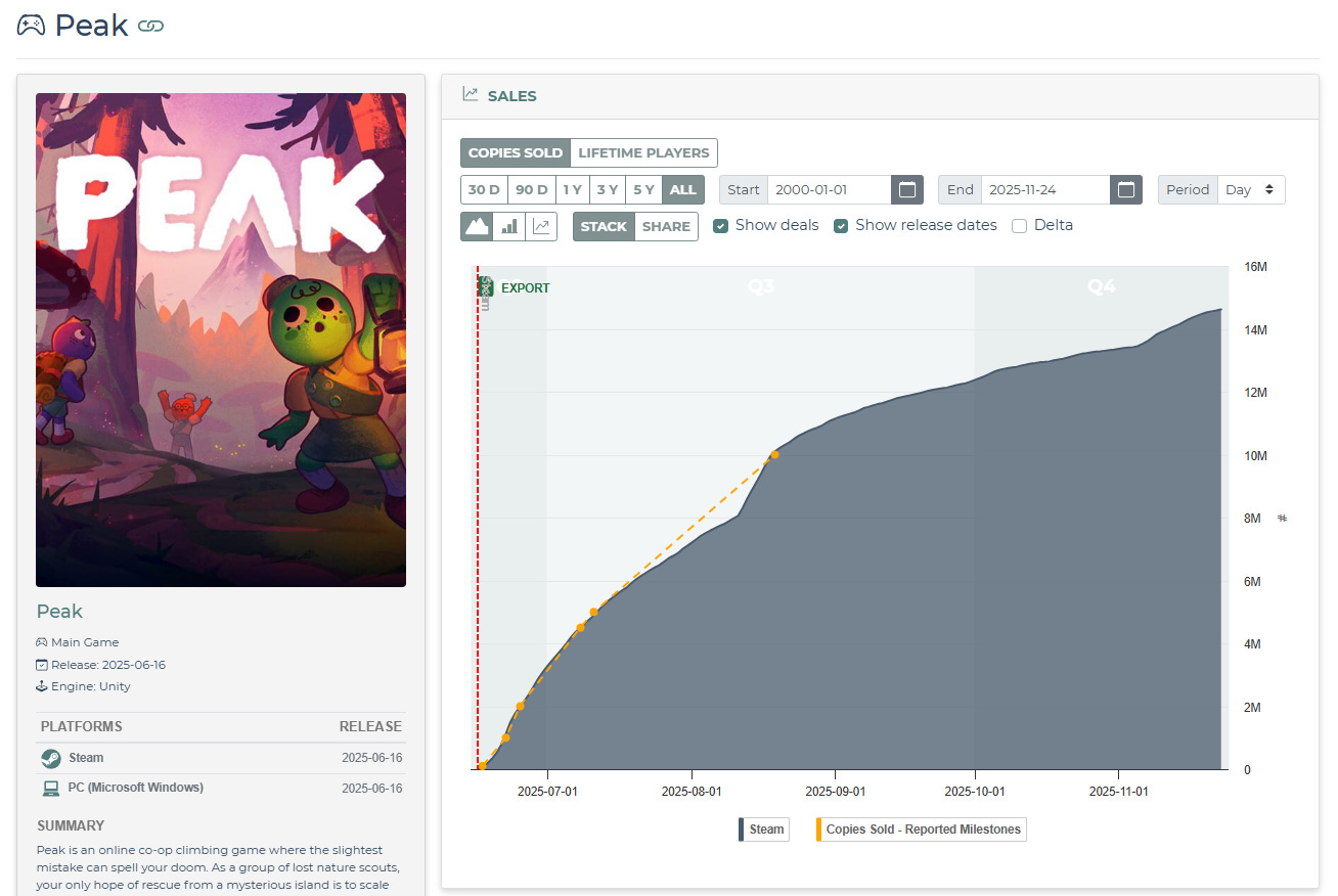 Аналитики Alinea Analytics оценивают, что продажи кооперативного симулятора скалолазания Peak скоро достигнут 15 млн копий.